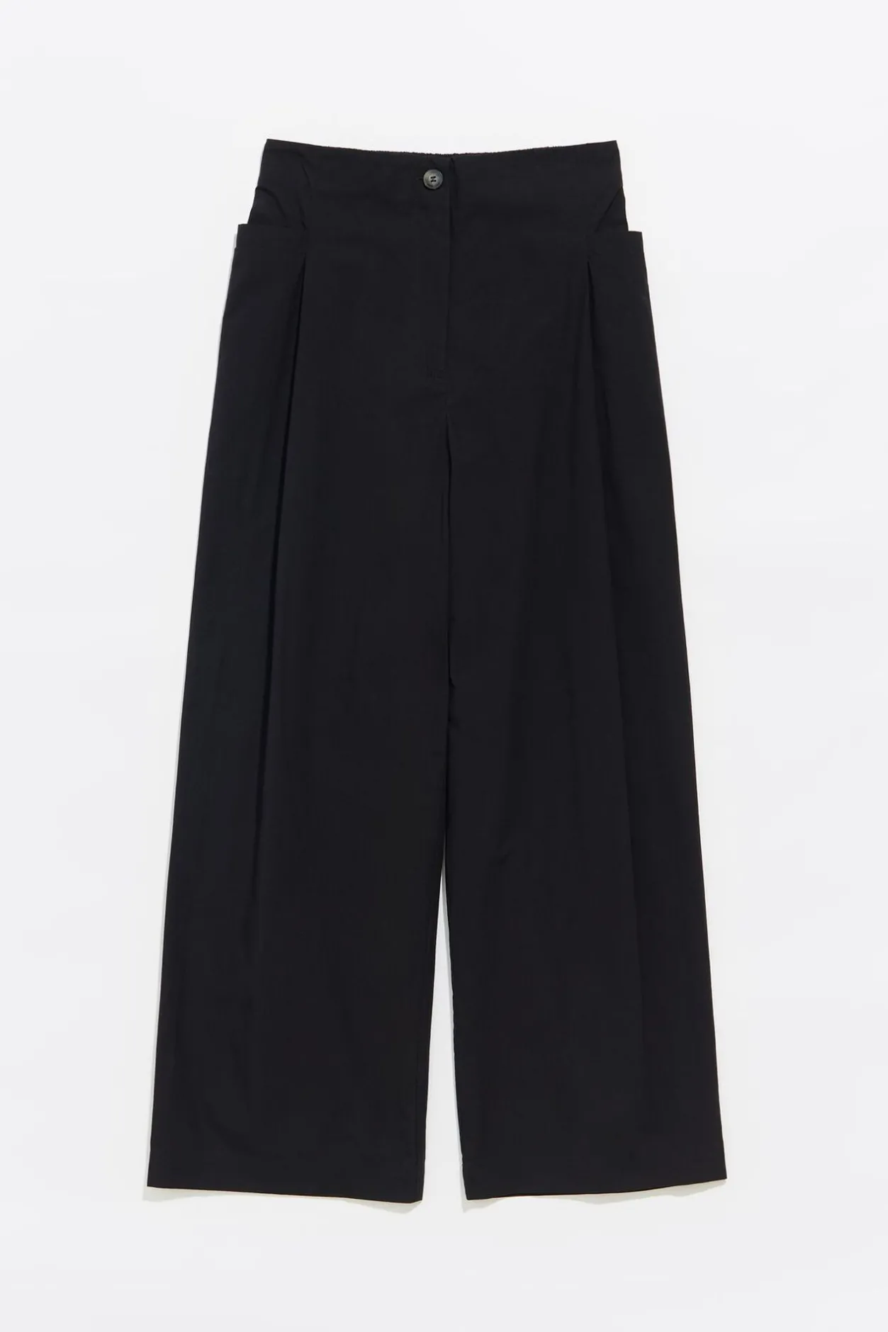 PantalÓN Campana De AlgodÓN En Color Negro. Modelo Con Largo Tobillero, Cierre De Cremallera Frontal Y Pinzas En El Delantero. Bolsillos Laterales Con Vivo Y Cintura Fruncida En La Espalda.