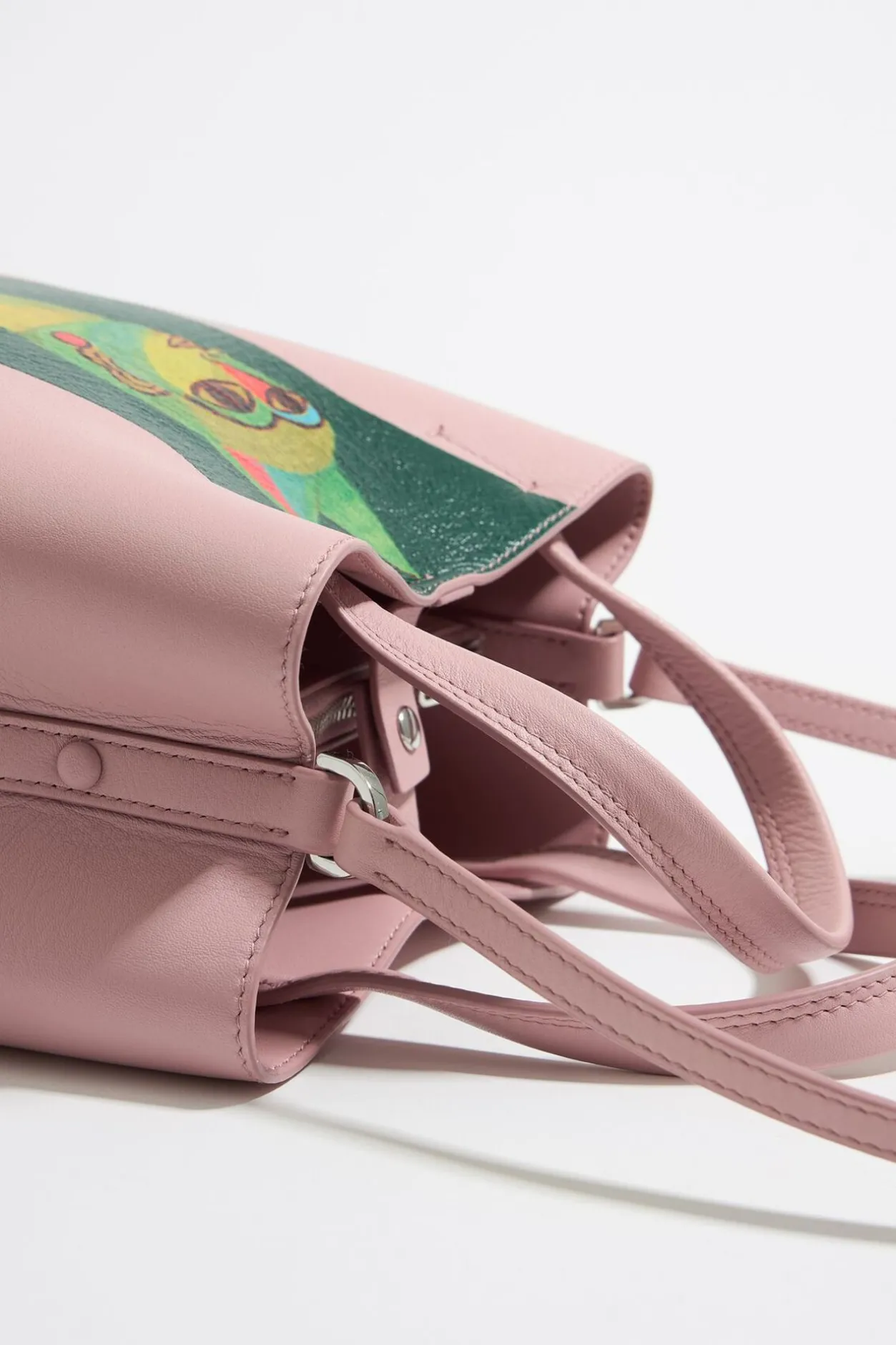 Bolso De Mano Chihuahua De Piel En Color Rosa Pastel; EdiciÓN Limitada Ilustrada En ColaboraciÓN Con La Artista Mexicana Ana Leovy. Modelo De TamaÑO PequeÑO, Cierre A PresiÓN, Doble Asa De Mano, Asa Larga De Piel Ajustable Y Bolsillo Interior Con Cremallera. Exterior Personalizado Con Logo MetÁLico.