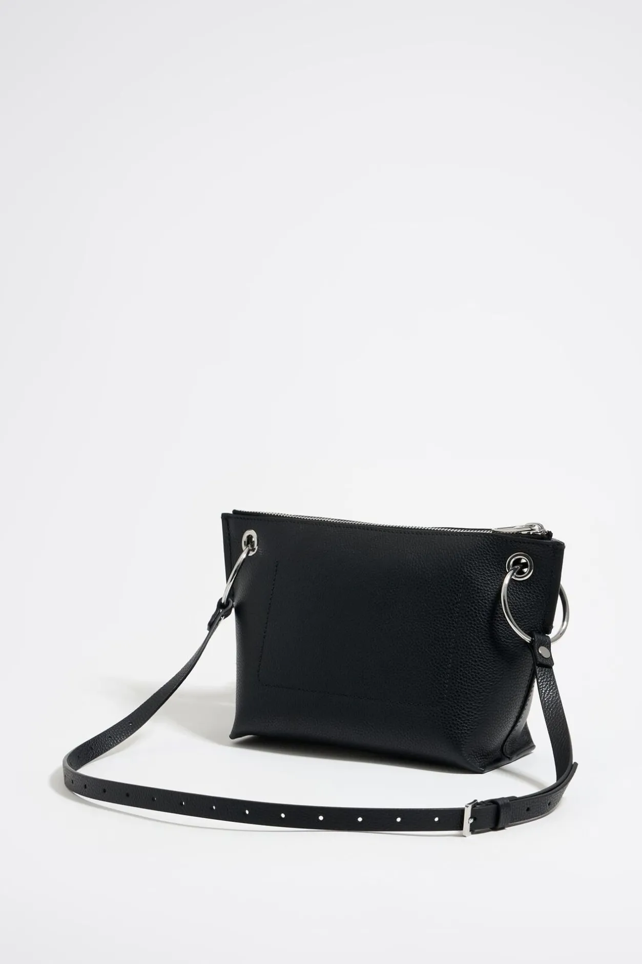 Bolso Trapecio De Piel En Color Negro. Modelo Con Cierre De Cremallera, Asa Larga De Piel Ajustable, Bolsillo Interior Y Charm Decorativo De Cordones Multicolor. Exterior Personalizado Con Logo MetÁLico.