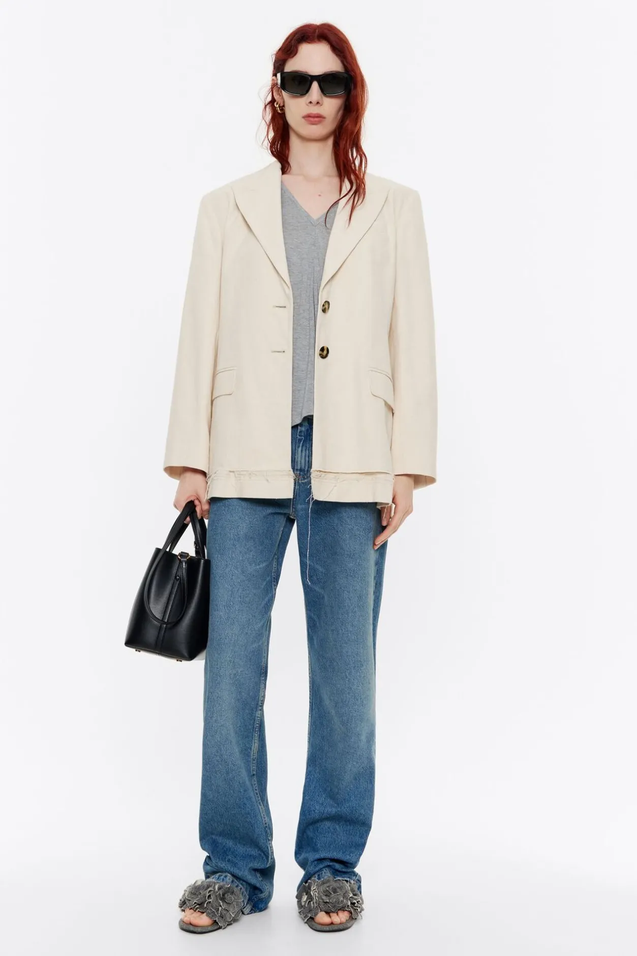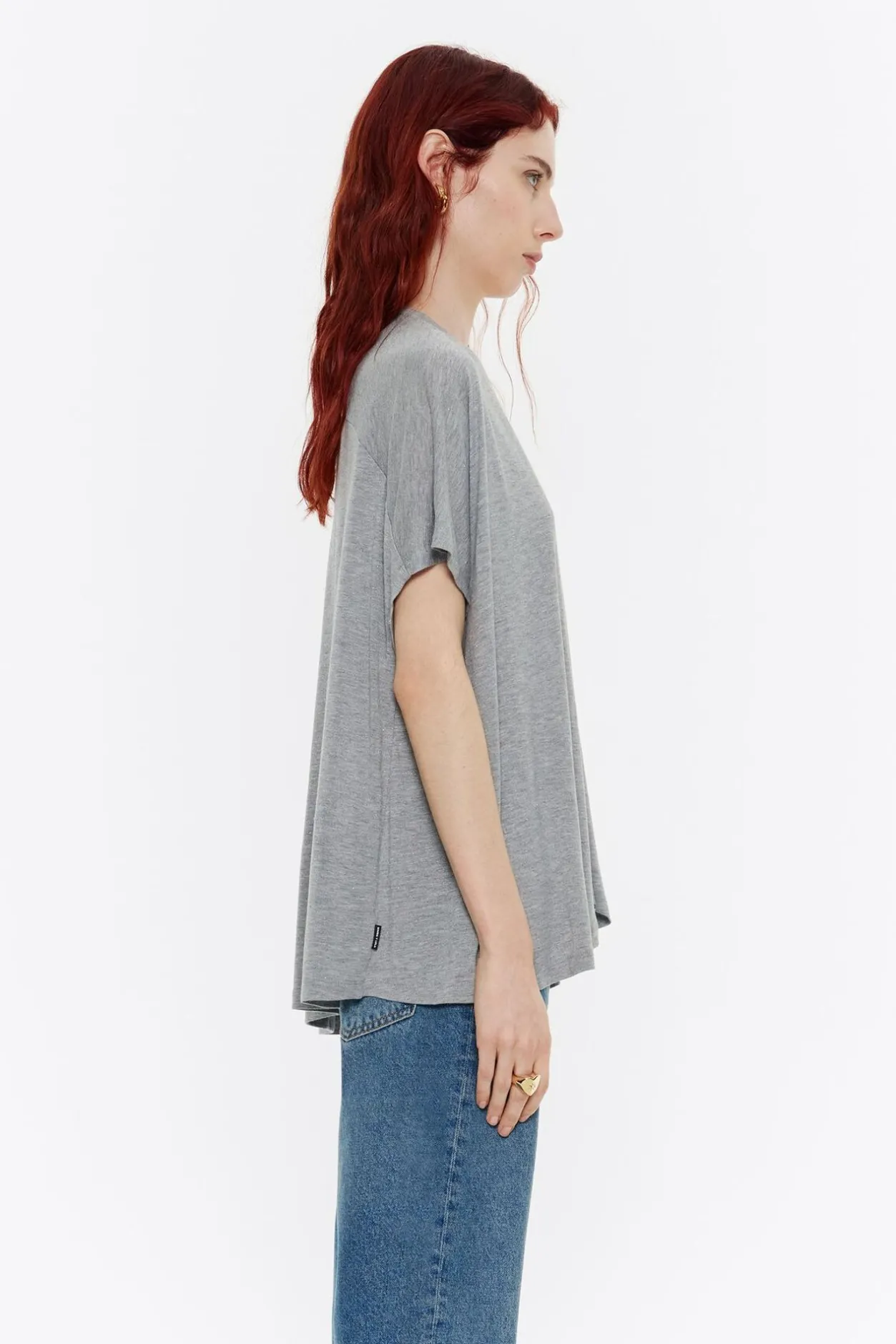 Camiseta Larga De LÚRex En Color Gris. Modelo De Corte Oversize, Cuello Pico, Manga Corta MurciÉLago Y Exterior Personalizado Con Etiqueta Logotipada.