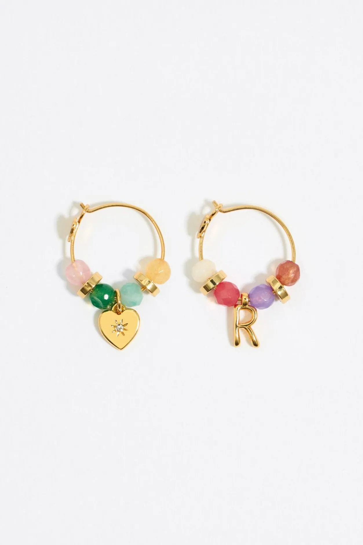 Pendientes De Aro Dorado Con Piedras Multicolores Y Colgantes En Metal Dorado De Letra R Y CorazÓN Con Cristal. Modelo Con Cierre De Gancho.
