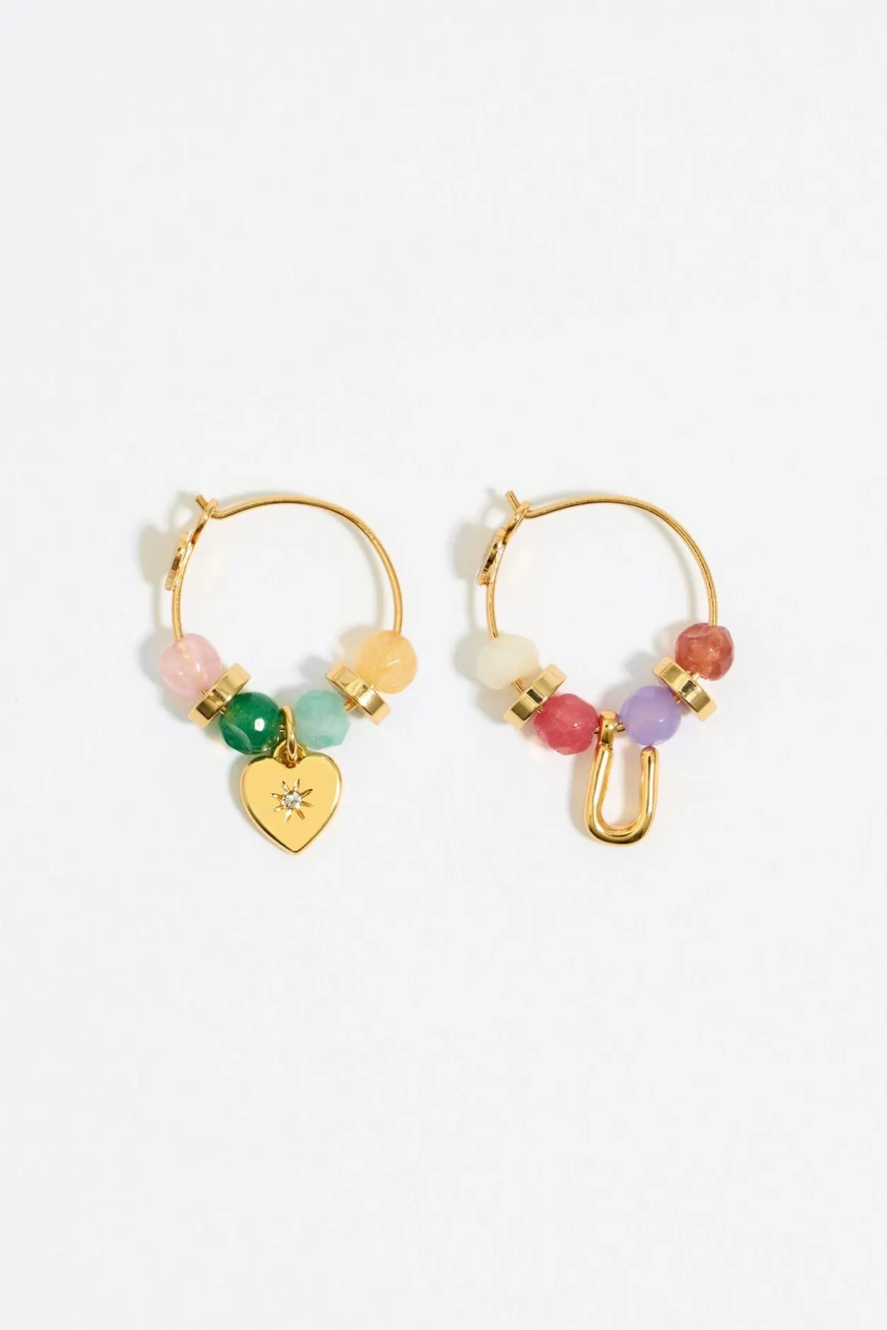 Pendientes De Aro Dorado Con Piedras Multicolores Y Colgantes En Metal Dorado De Letra U Y CorazÓN Con Cristal. Modelo Con Cierre De Gancho.