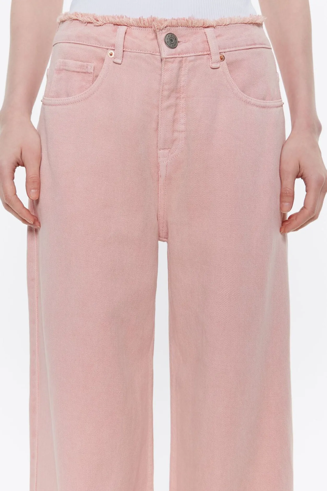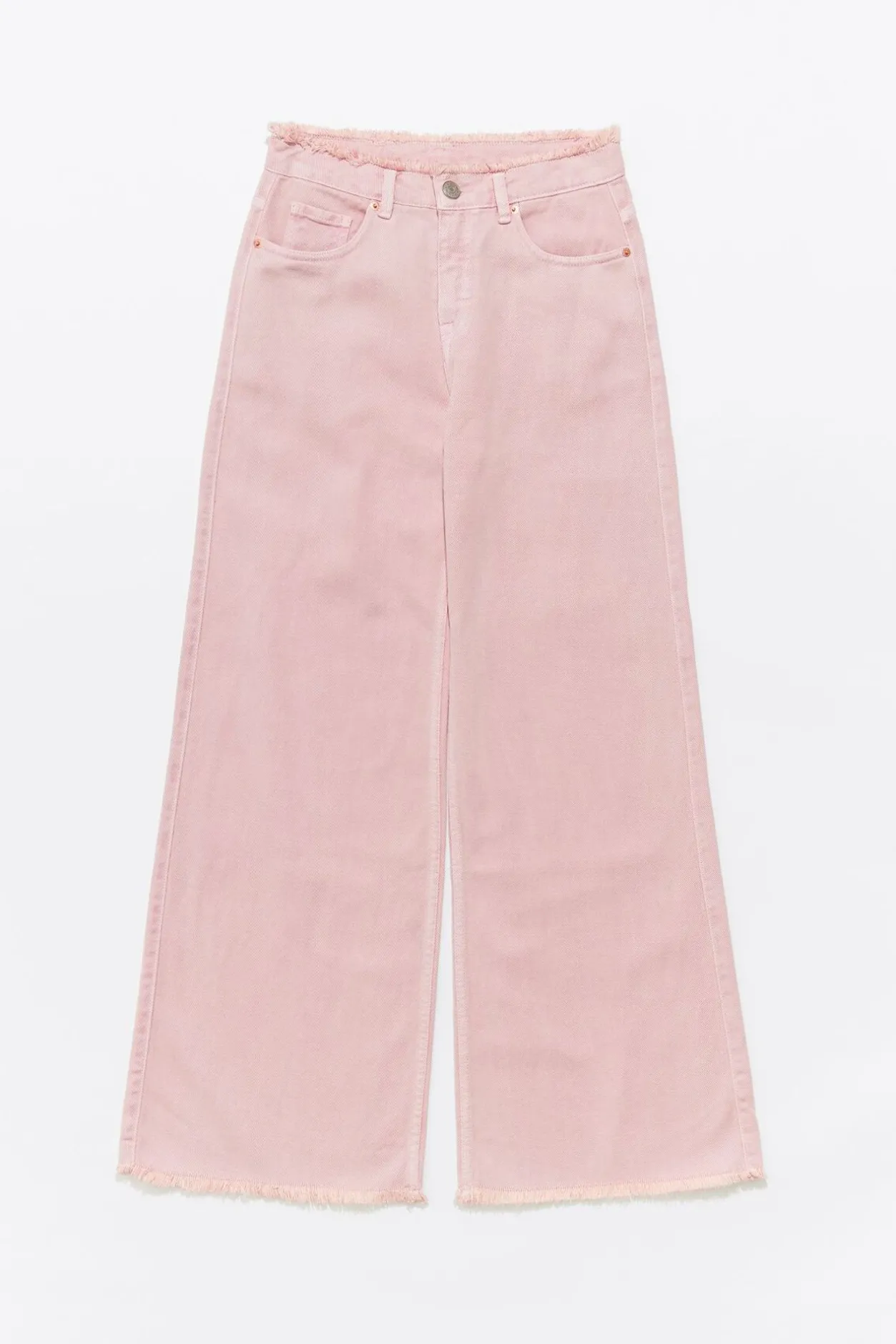PantalÓN Vaquero En Color Rosa. Modelo De Corte Wide Leg, Tiro Alto, Cierre Frontal Con BotÓN Denim Y Cinco Bolsillos. Desflecado En Cintura. Este Modelo Contiene 20% AlgodÓN Reciclado.