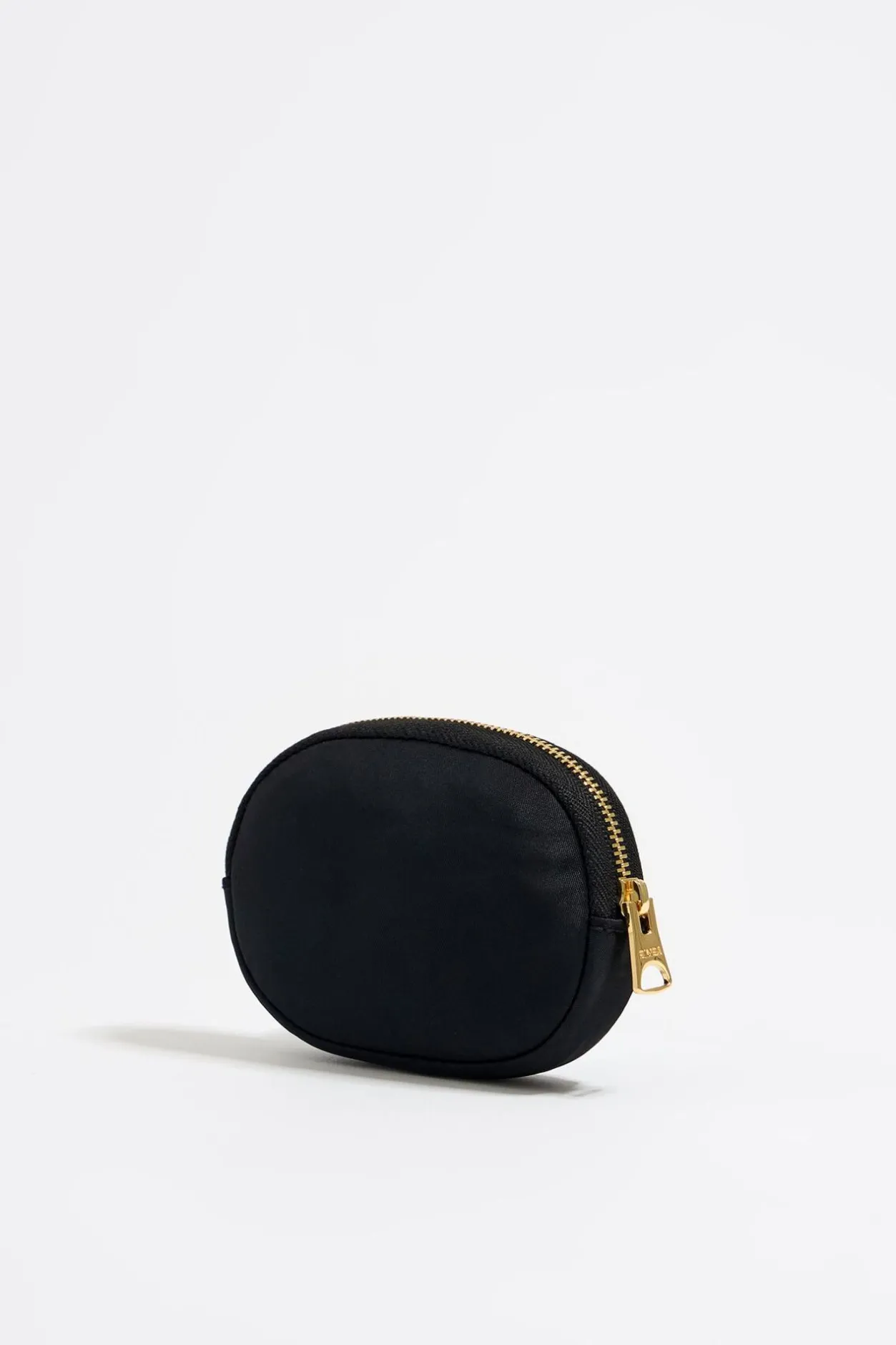 Monedero Ovalado De Nylon En Color Negro. Modelo Con Cierre De Cremallera Y Exterior Personalizado Con Logo MetÁLico.