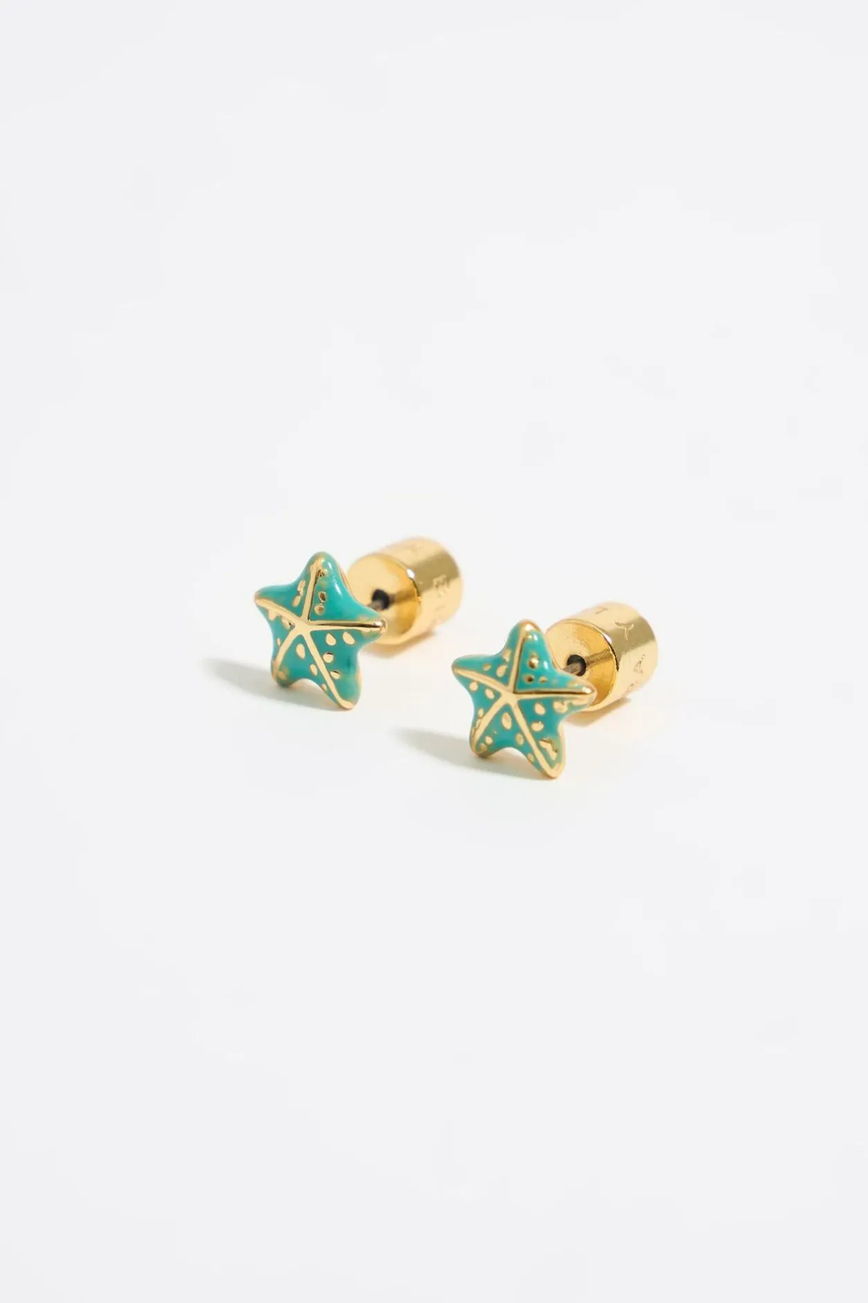 Pendientes Dorados En Forma De Estrella De Mar En Color Aguamarina. Modelo Con Cierre De PresiÓN.