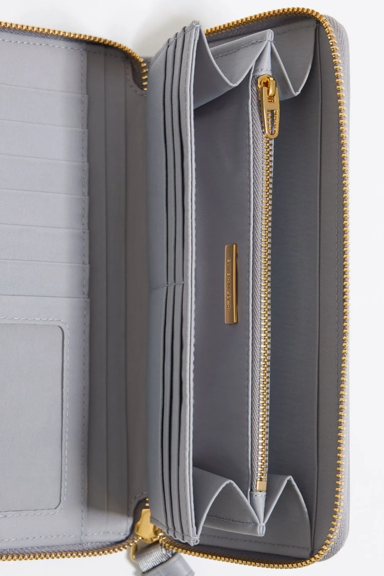 Billetera Horizontal De Nylon En Color Lila Empolvado. Modelo Con Cierre De Cremallera, Asa En Tejido Logotipada E Interior Con Monedero Y Tarjetero. Exterior Personalizado Con Logo MetÁLico.