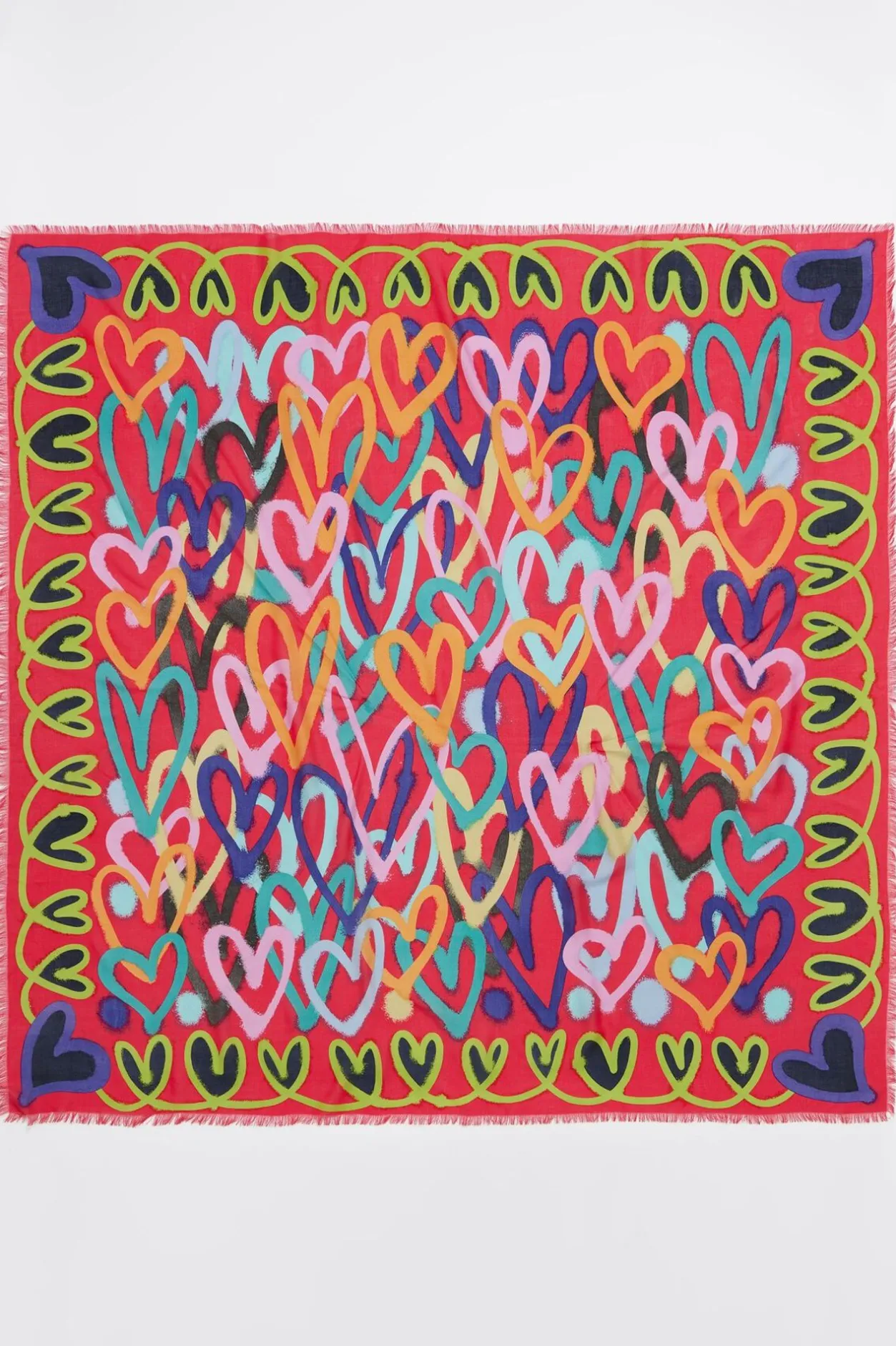 Chal Cuadrado Con Estampado De Corazones Multicolor Con Trazo De Grafiti Sobre Fondo Fresa.
