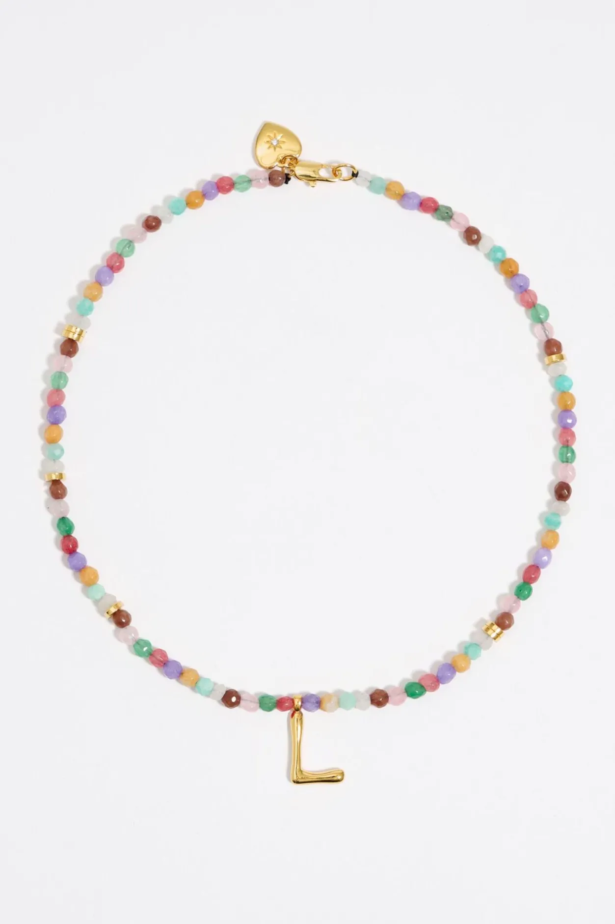 Collar Corto De Piedras Multicolores Con Letra L De Metal Dorado. Modelo Con Cierre De MosquetÓN Y Pieza En Forma De CorazÓN De Metal Dorado Con Cristal.