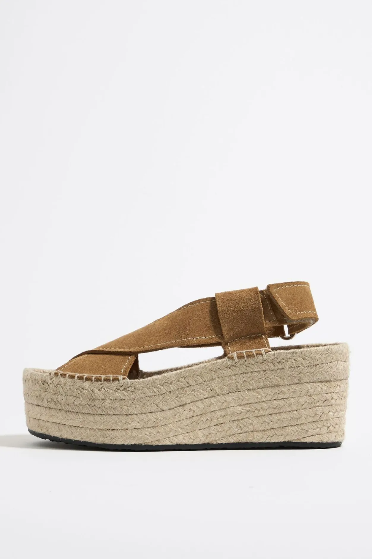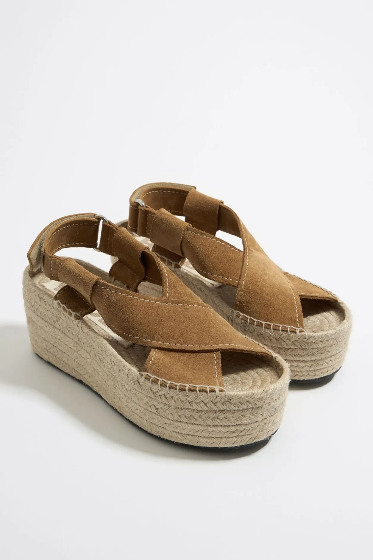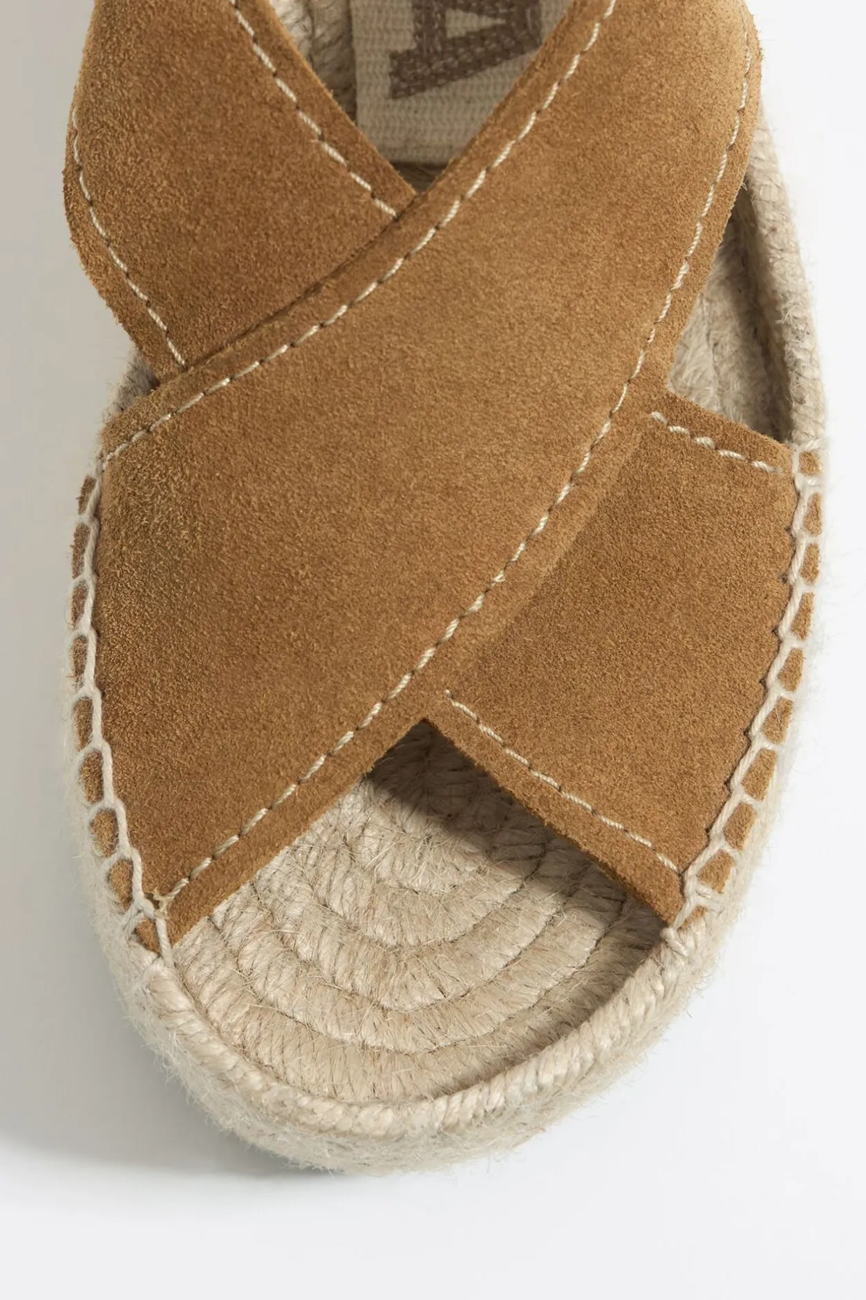 Sandalia De CuÑA De Serraje En Color MarrÓN. Modelo De Tiras Cruzadas Con Cierre Trasero Por Contacto. Etiqueta Con Logo Bordado En Plantilla Y Piso Plataforma De Yute Con Suela Personalizada.