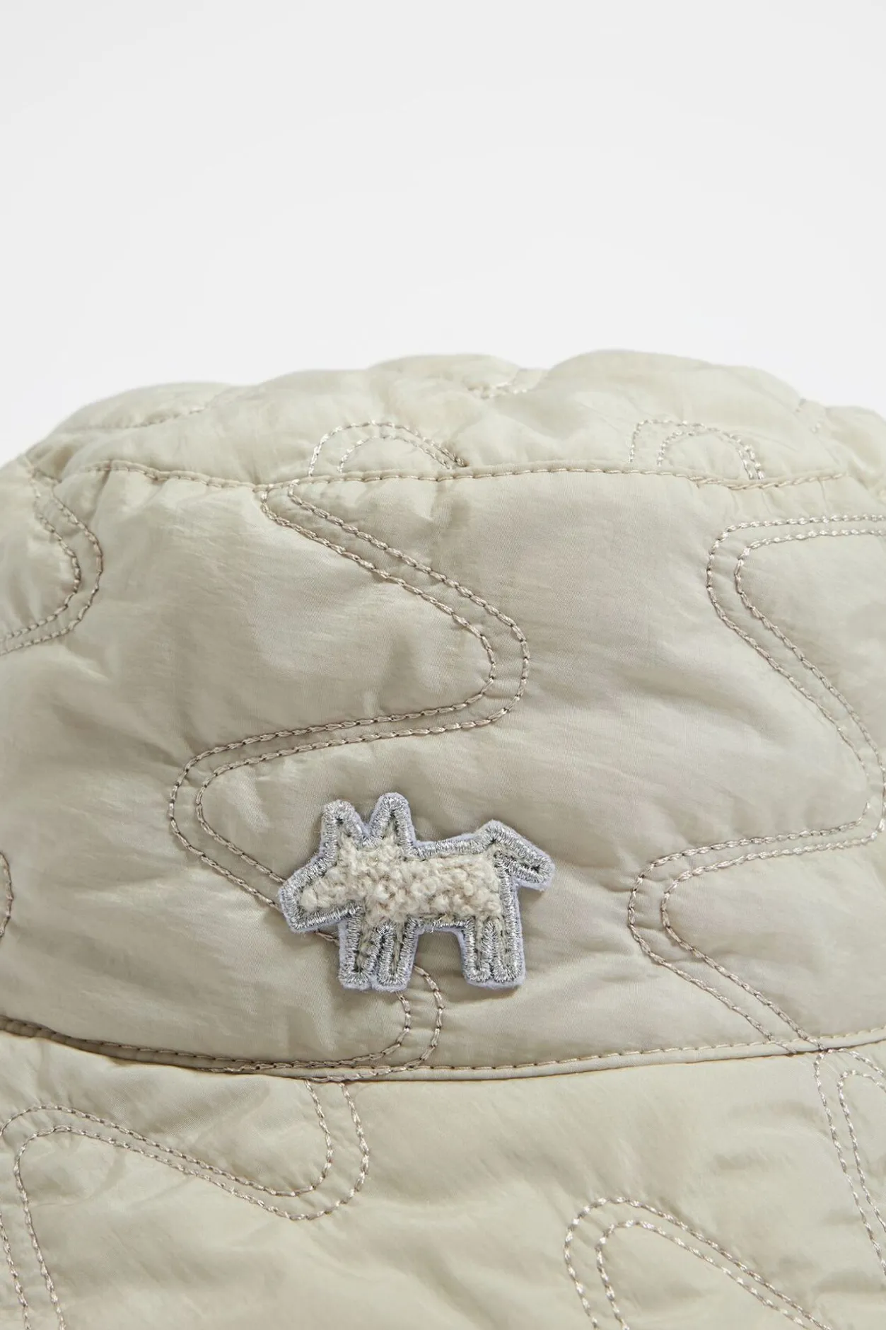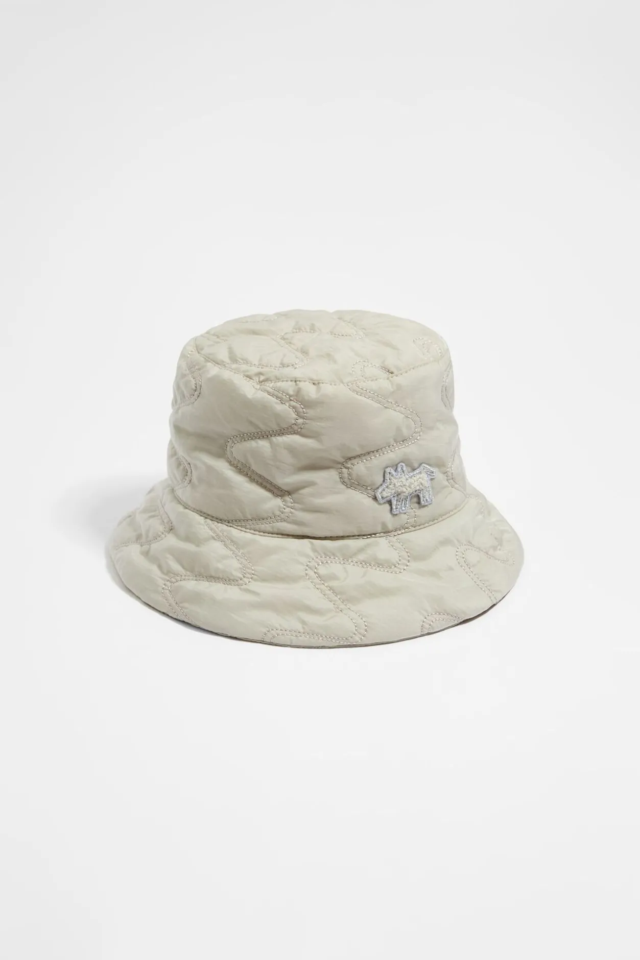 Gorro Tipo Bucket De Nylon Acolchado En Color Piedra. Modelo Personalizado Con Logo Lola En La Parte Lateral. 90% Relleno PoliÉSter Reciclado.