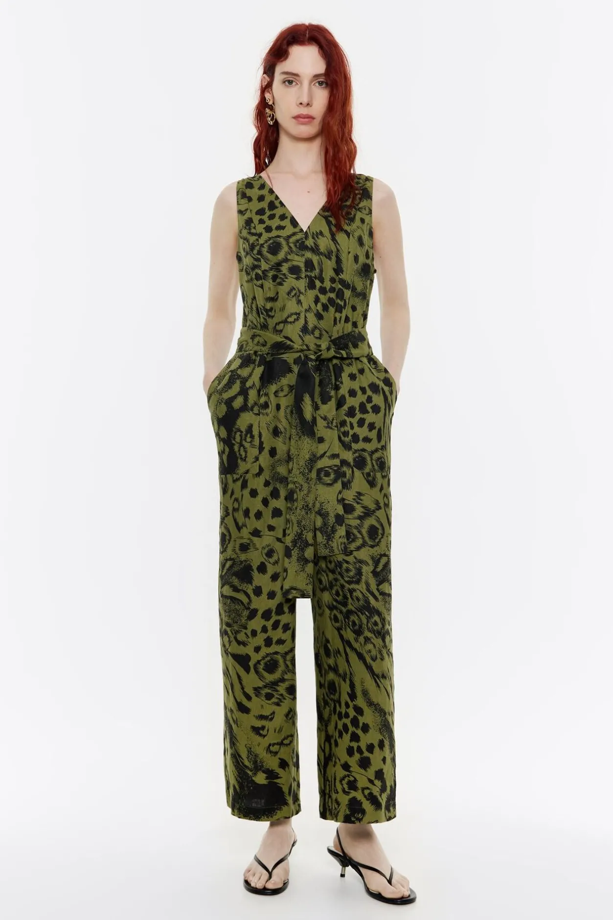Mono De Lino Con Print Animal Mix En Color Verde. Modelo De Corte Recto, Largo Tobillero, Escote En V, Manga Sisa Y Cierre Con Cremallera Trasera Invisible. CinturÓN De Tejido Y Bolsillos En Costuras.