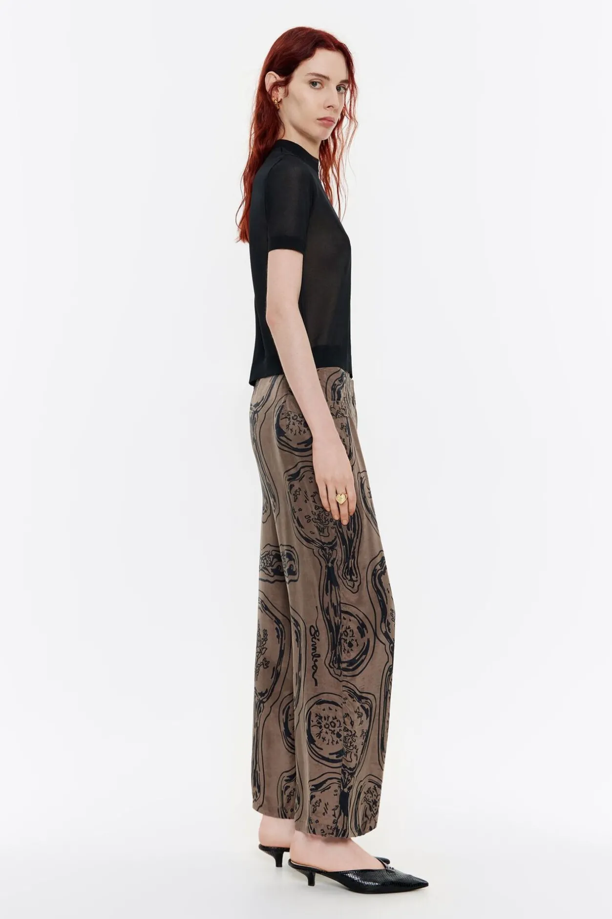 PantalÓN Recto Fluido De Lyocell Con Print Mirrors En Color Caqui. Modelo Con Largo Tobillero, Cierre Con Cremallera Frontal Y Cintura Con ElÁStico Interior. Bolsillos Falsos Con Tapetas Laterales. Este Modelo Contiene 47% Viscosa De ProducciÓN Responsable.