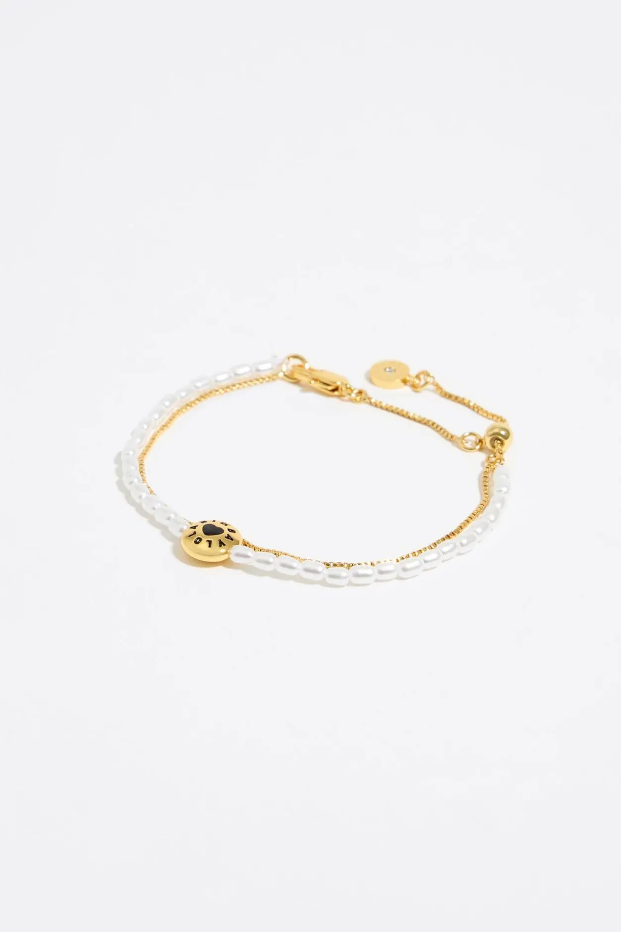 Pulsera Doble De Perlas Y Cadena De Metal Dorado Con Logo Candy En Color Negro. Modelo Con Cierre De MosquetÓN. Personalizado Con El Logo Grabado.