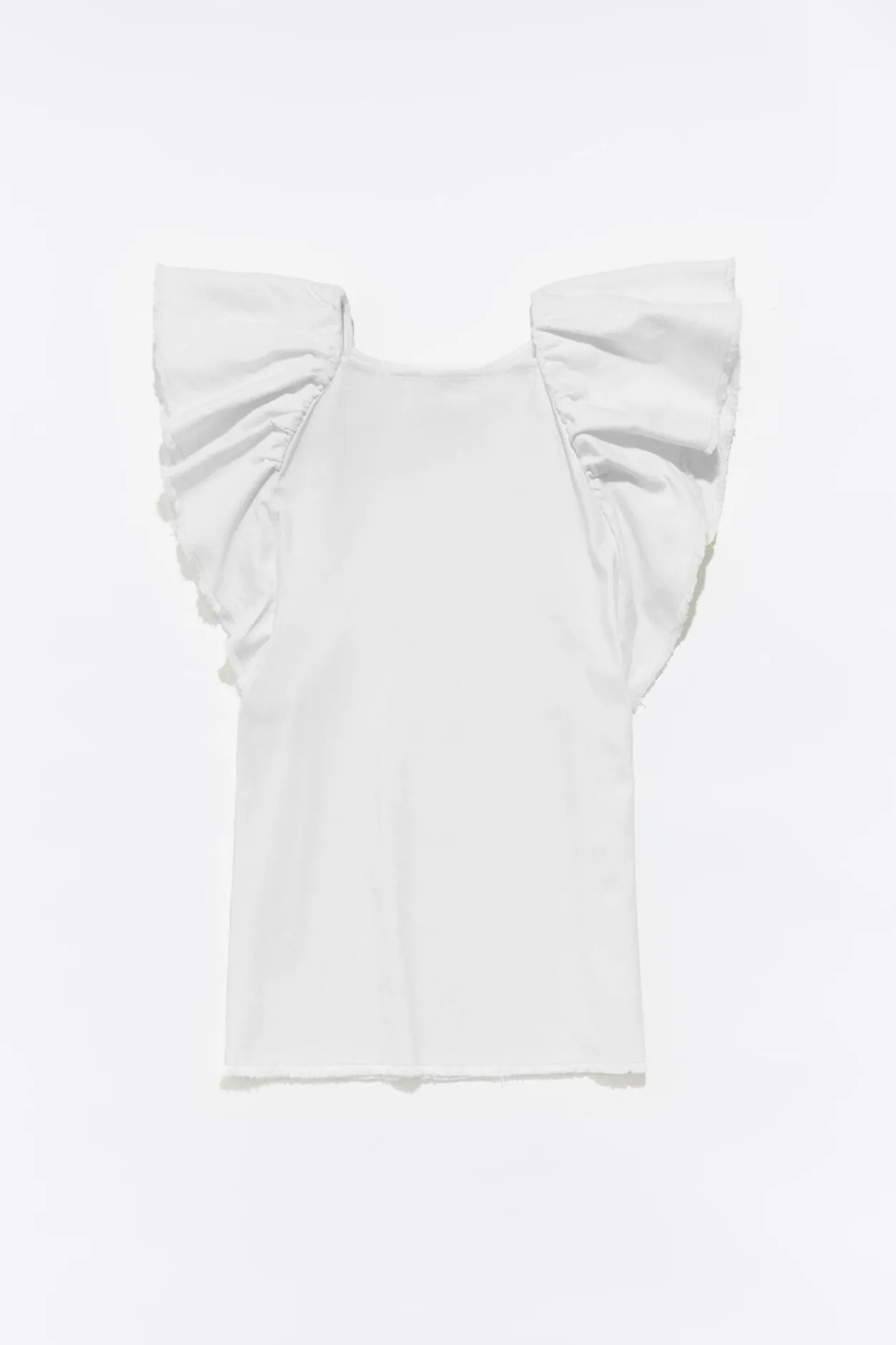 Vestido Denim Corto En Color Crudo. Modelo De Corte Recto, Escote Barco, Manga Sisa Con Maxivolante Desflecado, Bolsillos En Costura Y Bajo Desflecado.