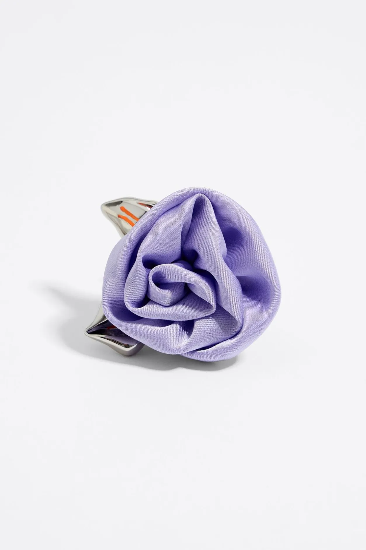 Anillo De Metal Plateado En Forma De Rosa De Tejido Lila Con Hojas Plateadas. Modelo Personalizado Con El Logo Grabado.