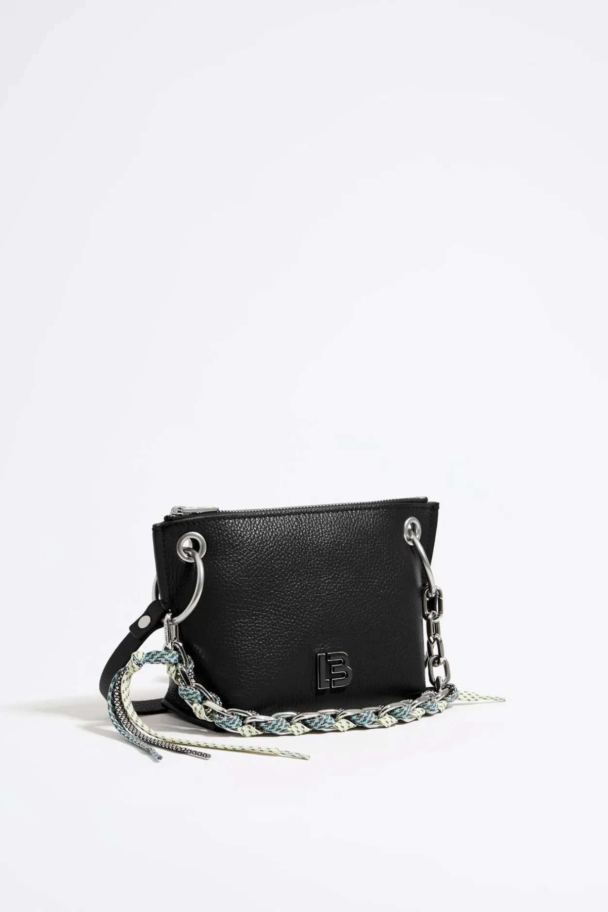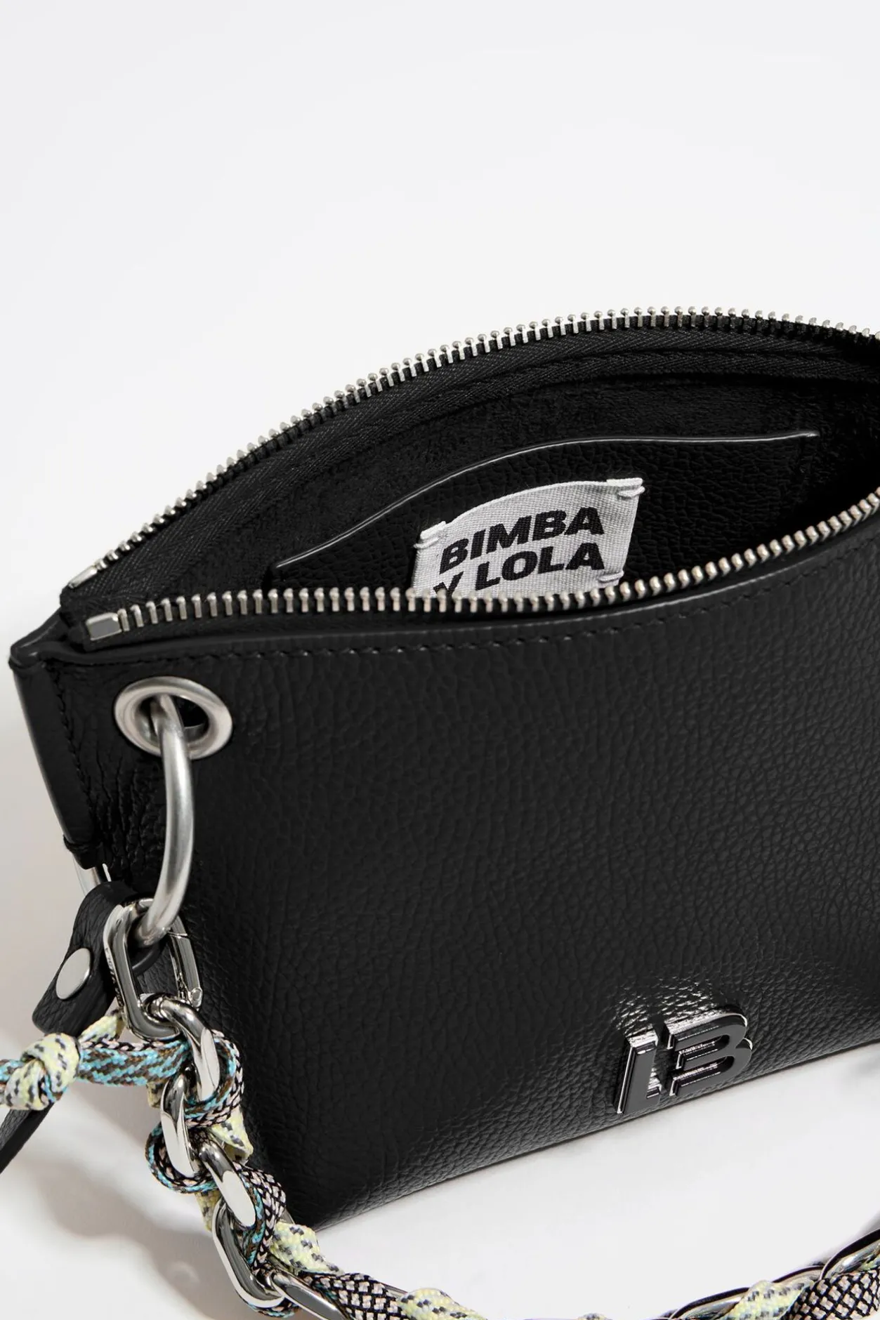 Bolso Bandolera De Piel En Color Negro. Modelo De TamaÑO PequeÑO En Forma De Trapecio, Cierre De Cremallera Y Doble Asa, De Cadena Corta Con Cordones Entrelazados Y Bandolera De Piel. Exterior Personalizado Con Logo Lb MetÁLico.