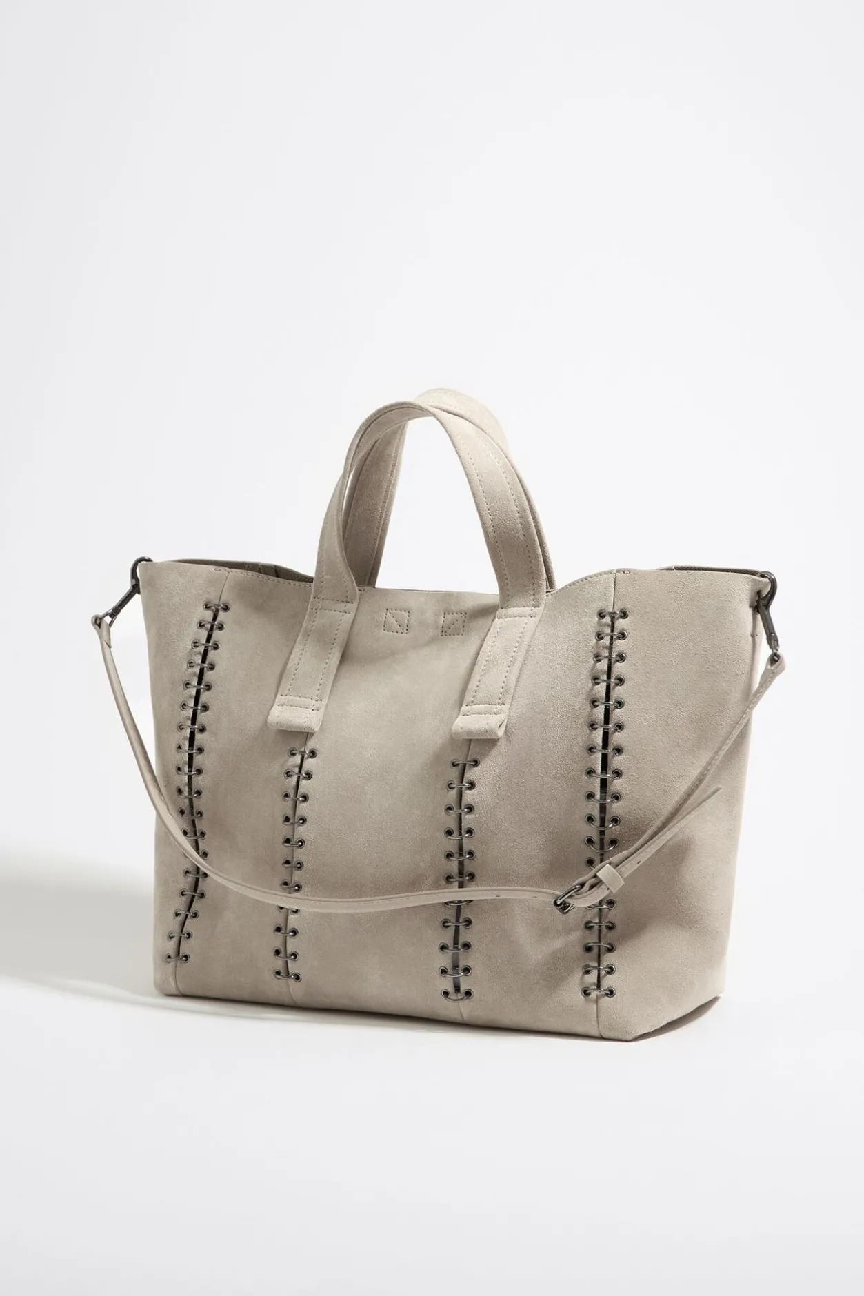 Bolso Shopper De Serraje En Color Piedra. Modelo De TamaÑO Grande, Cierre MagnÉTico, Asa Larga De Piel Ajustable, Doble Asa De Mano Y Bolsillo Interior. Exterior Personalizado Con Logo MetÁLico Y 116 Anillas De Metal Plateado.