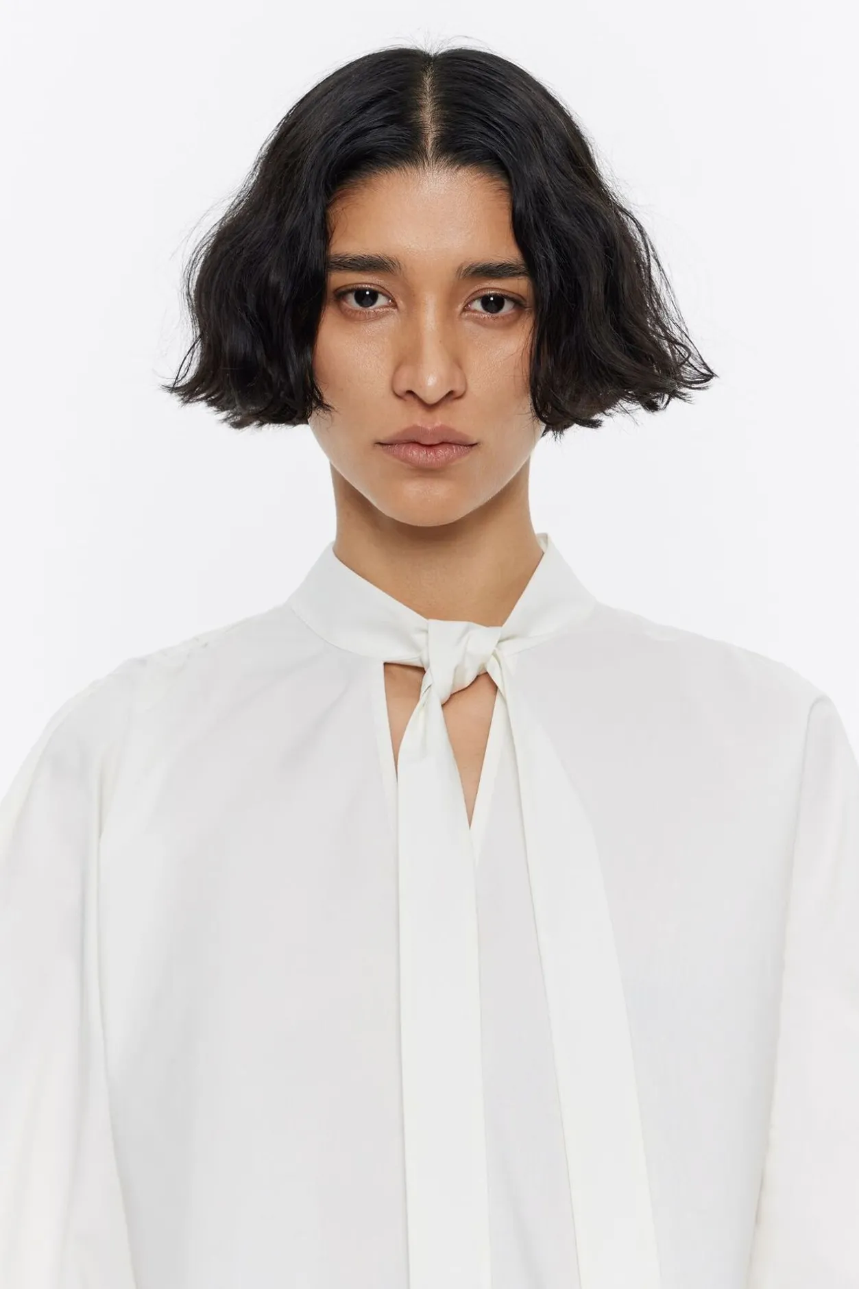 Camisa Larga De AlgodÓN En Color Marfil. Modelo De Corte LÍNea A, Con Cuello Mao Con Lazo A Modo De Cierre Y Manga Larga Ancha Con Pespunte Bordado En PuÑOs. Hombros Fruncidos Y Pespunte Bordado En Bajo.