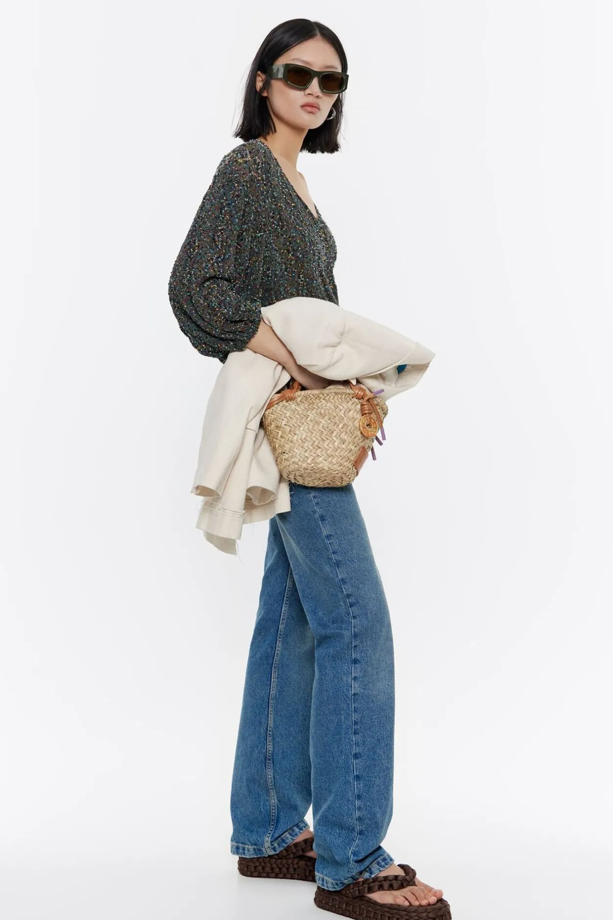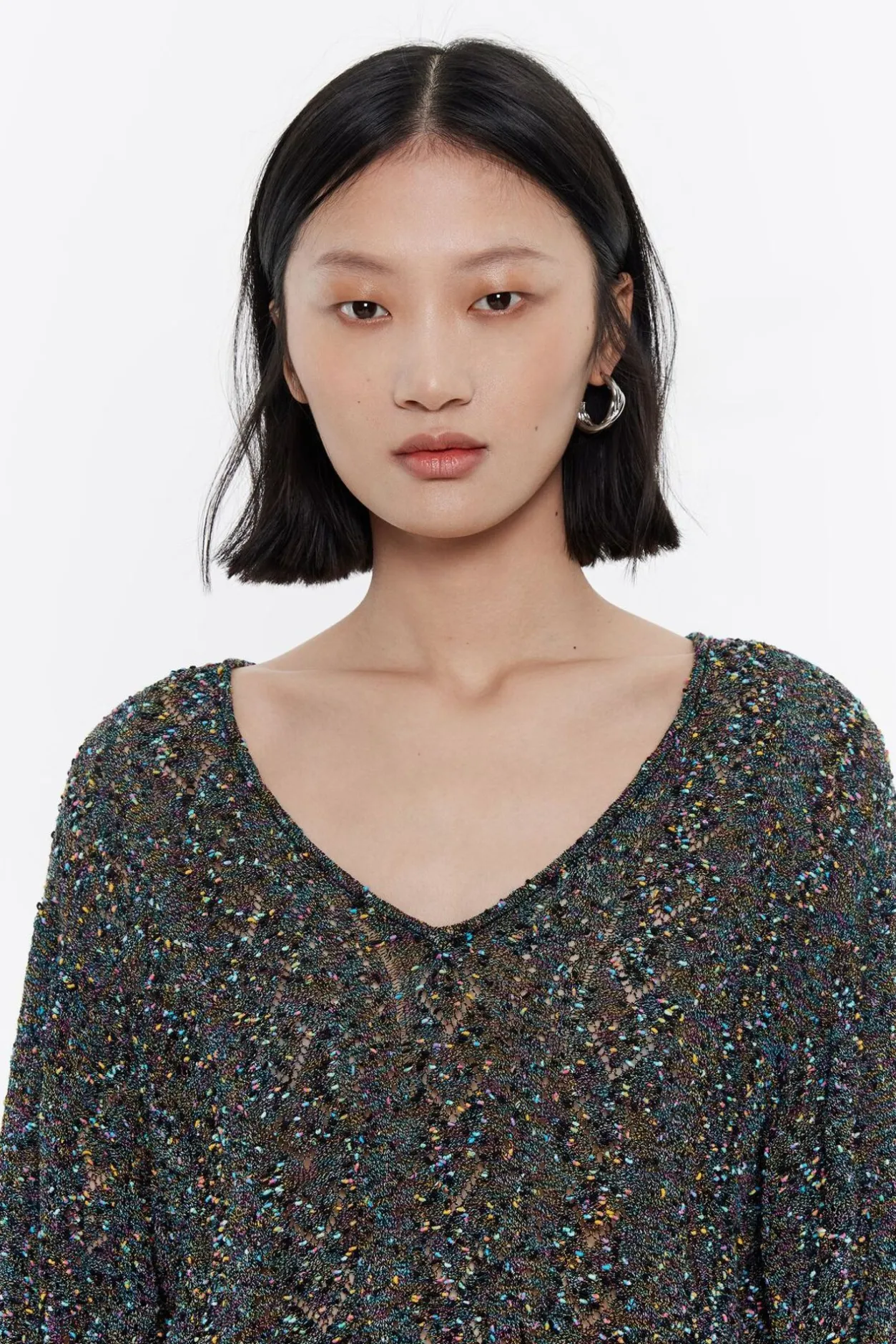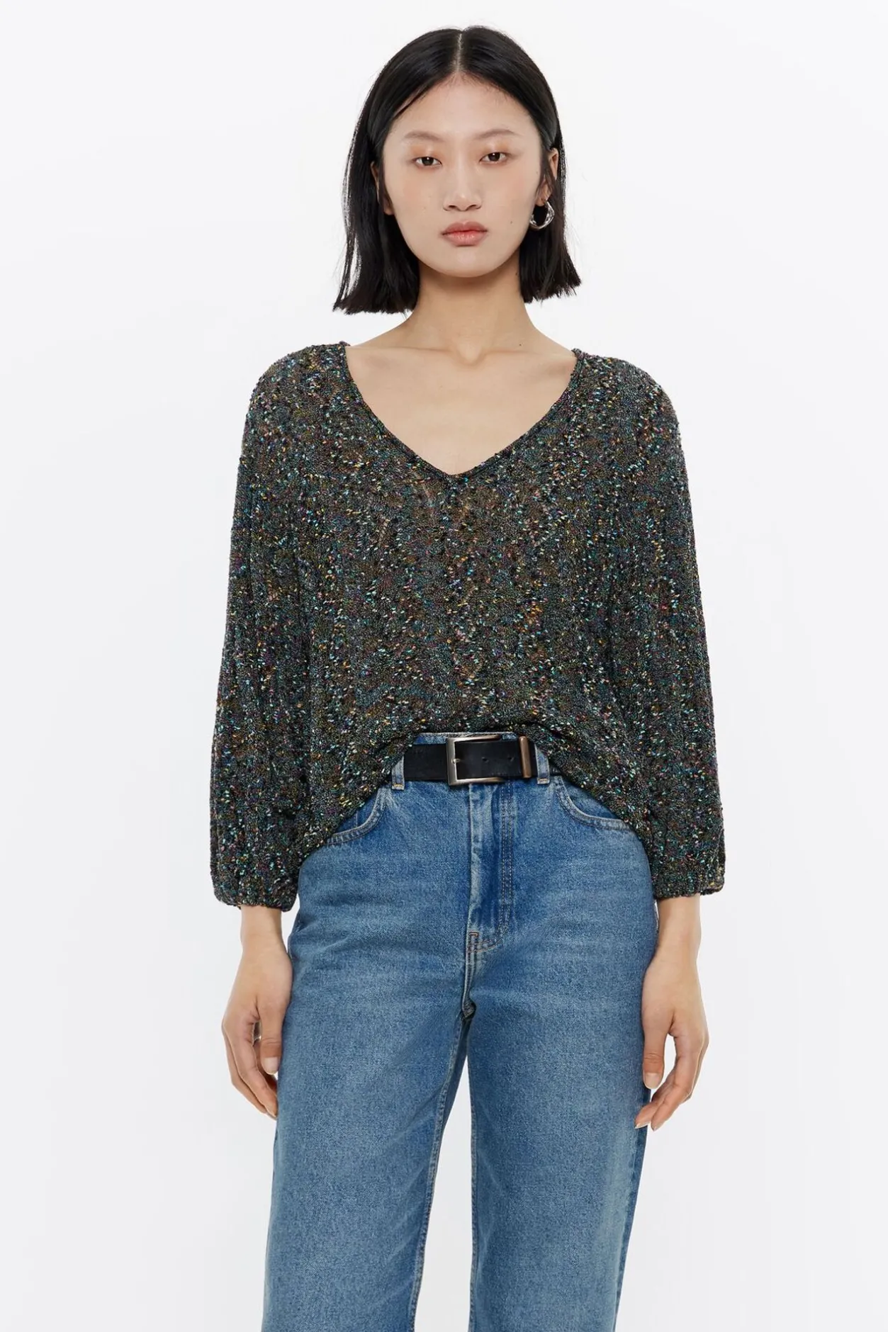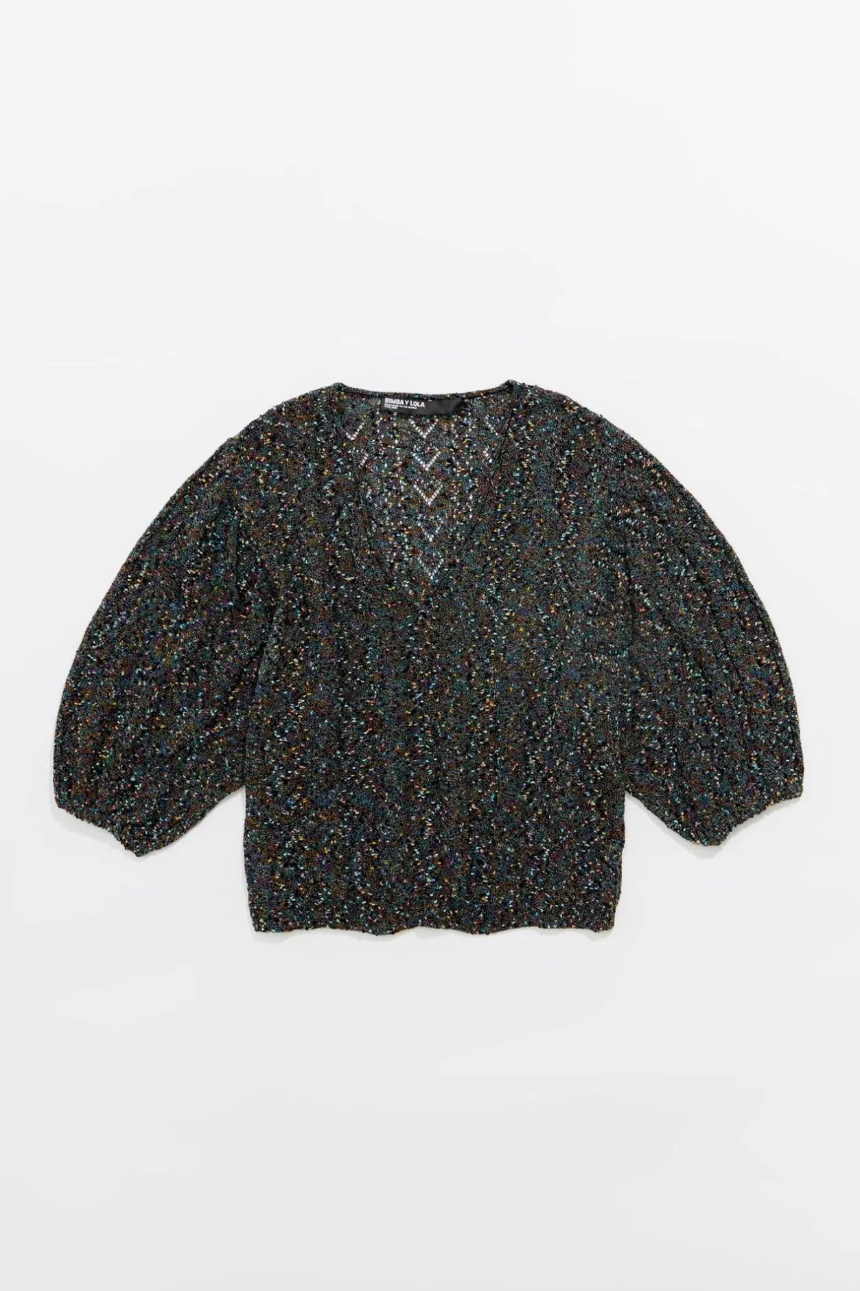 Jersey De Punto Calado En Color Negro. Modelo De Corte Recto, Escote En V Pronunciado Y Manga 3/4 Abullonada.