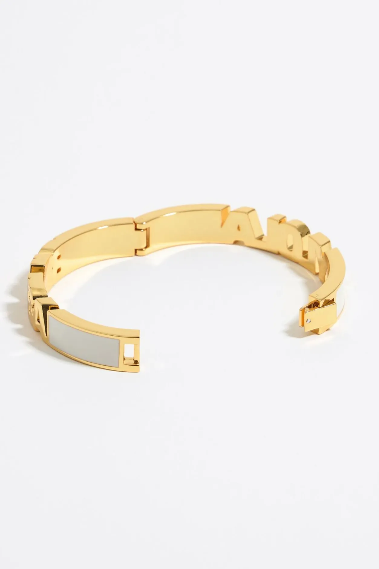 Pulsera De Metal Dorado Con Logo Y Esmalte En Color Marfil. Modelo Con Cierre De Bisagra.