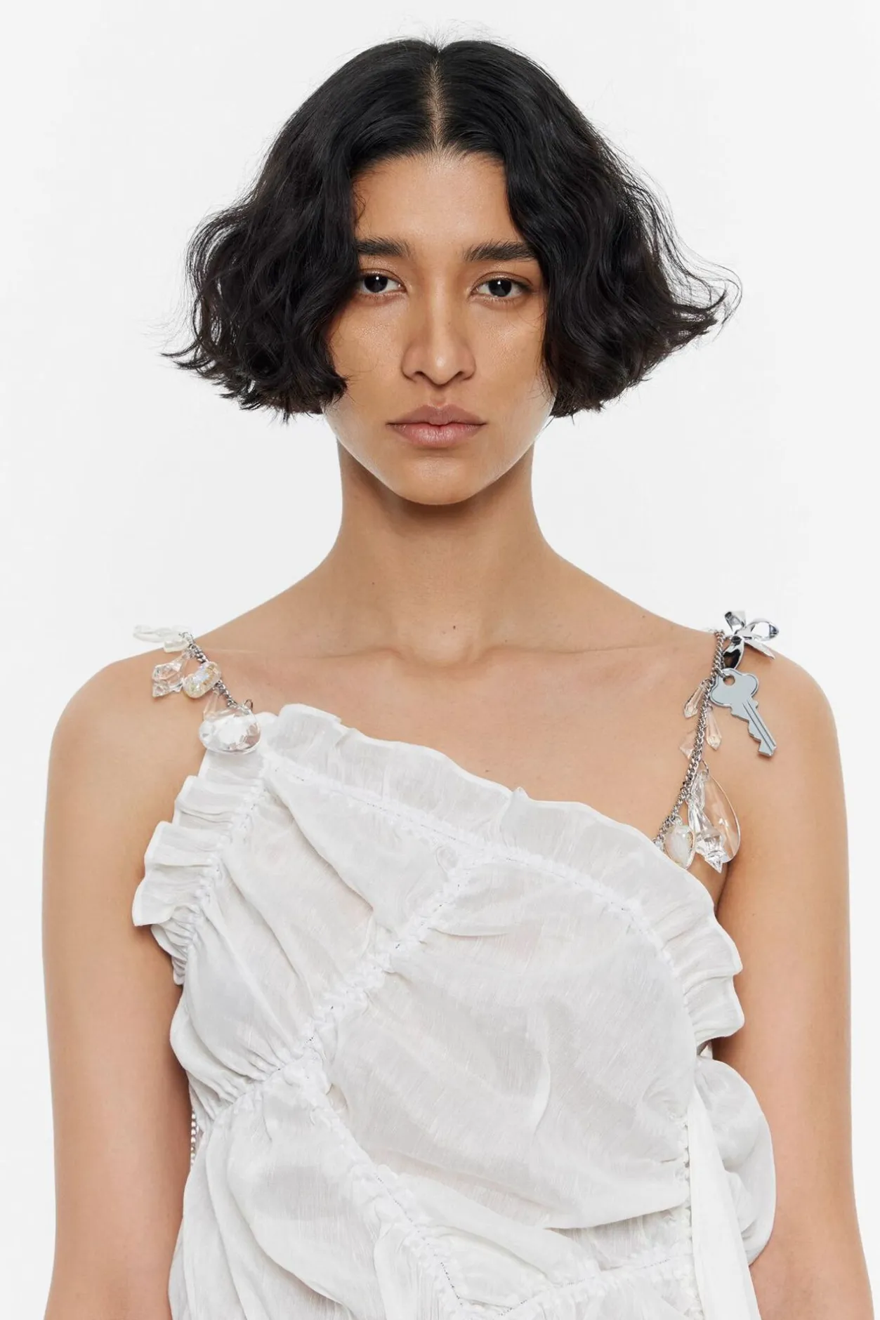 Vestido Fruncido Mini De Lino En Color Marfil. Modelo Con Escote Recto, Tirantes De Cadenas Con Multipiezas Y Maxi PaÑUelo En El Lateral.