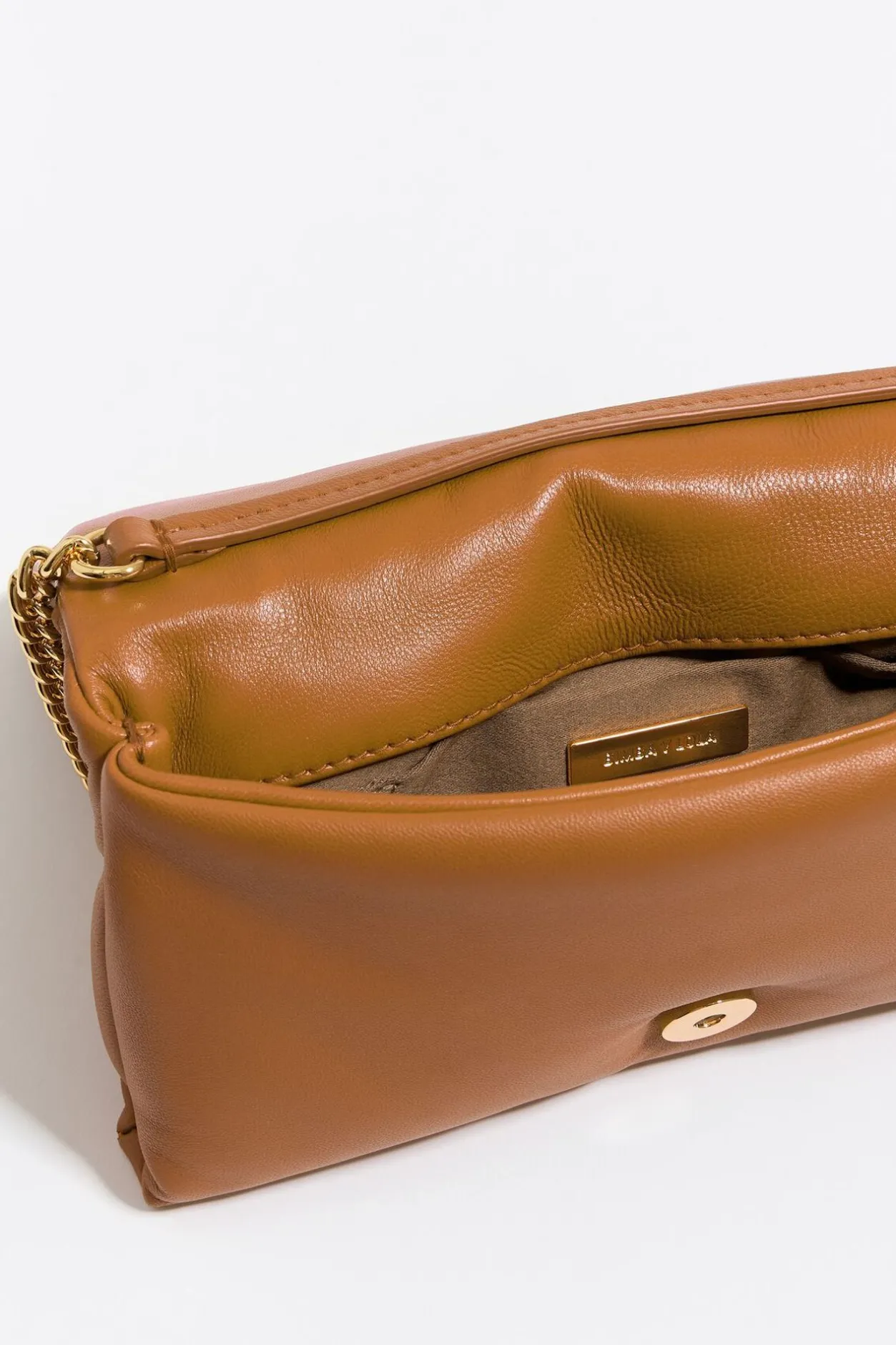 Bolso Bandolera De Piel Napa En Color Tostado. Modelo De TamaÑO Mini Con Cierre De Solapa, Asa De Cadena Y Bolsillo Interior. Exterior Personalizado Con Logo Lb MetÁLico.