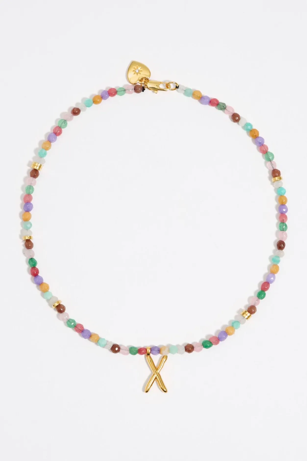Collar Corto De Piedras Multicolores Con Letra X De Metal Dorado. Modelo Con Cierre De MosquetÓN Y Pieza En Forma De CorazÓN De Metal Dorado Con Cristal.