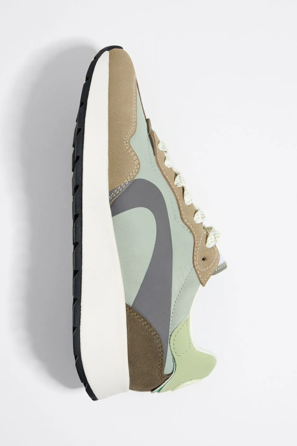 Deportiva Lifestyle En Color Caqui. Modelo Confeccionado Con Piezas En Serraje Y Tejidos TÉCnicos. Logo Lateral Con Glitter Y LengÜEta Con Logo Chimo. Parte Trasera Con Logo En El TalÓN. Piso Bicolor Personalizado Con Acabado Dentado.