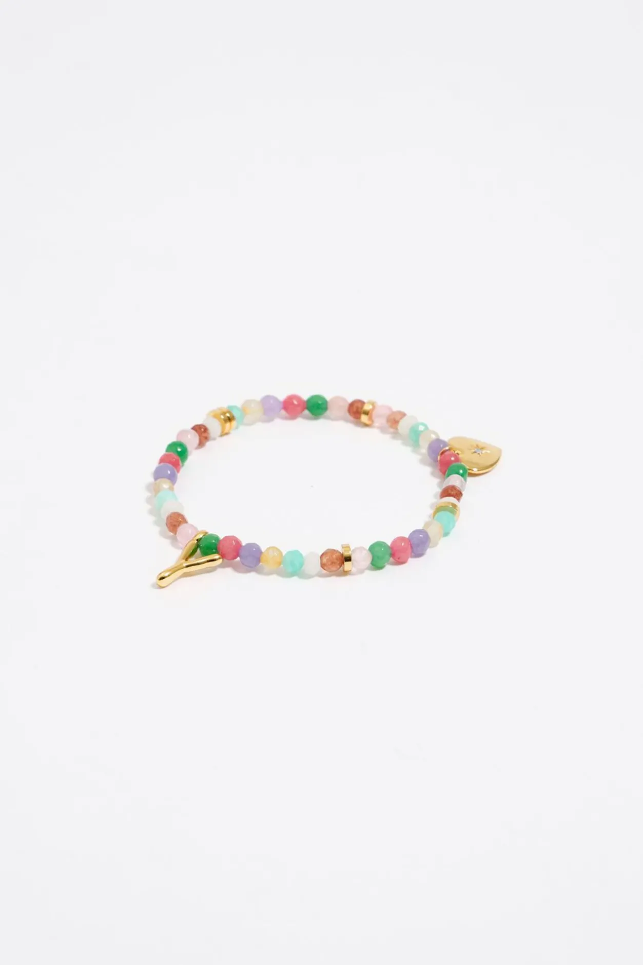 Pulsera ElÁStica De Piedras Multicolores Con Letra Y De Metal Dorado. Modelo Con Pieza En Forma De CorazÓN De Metal Dorado Con Cristal.