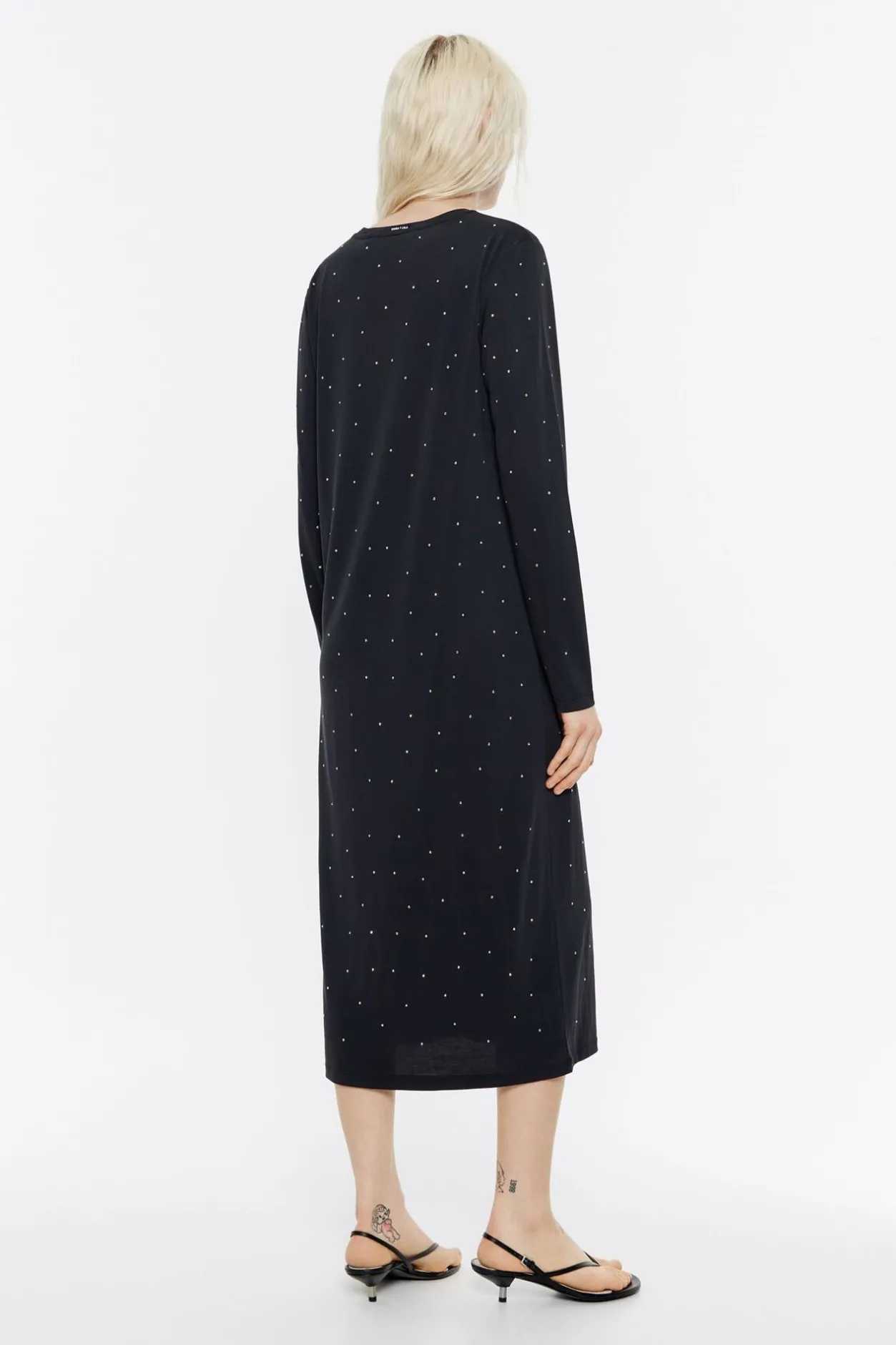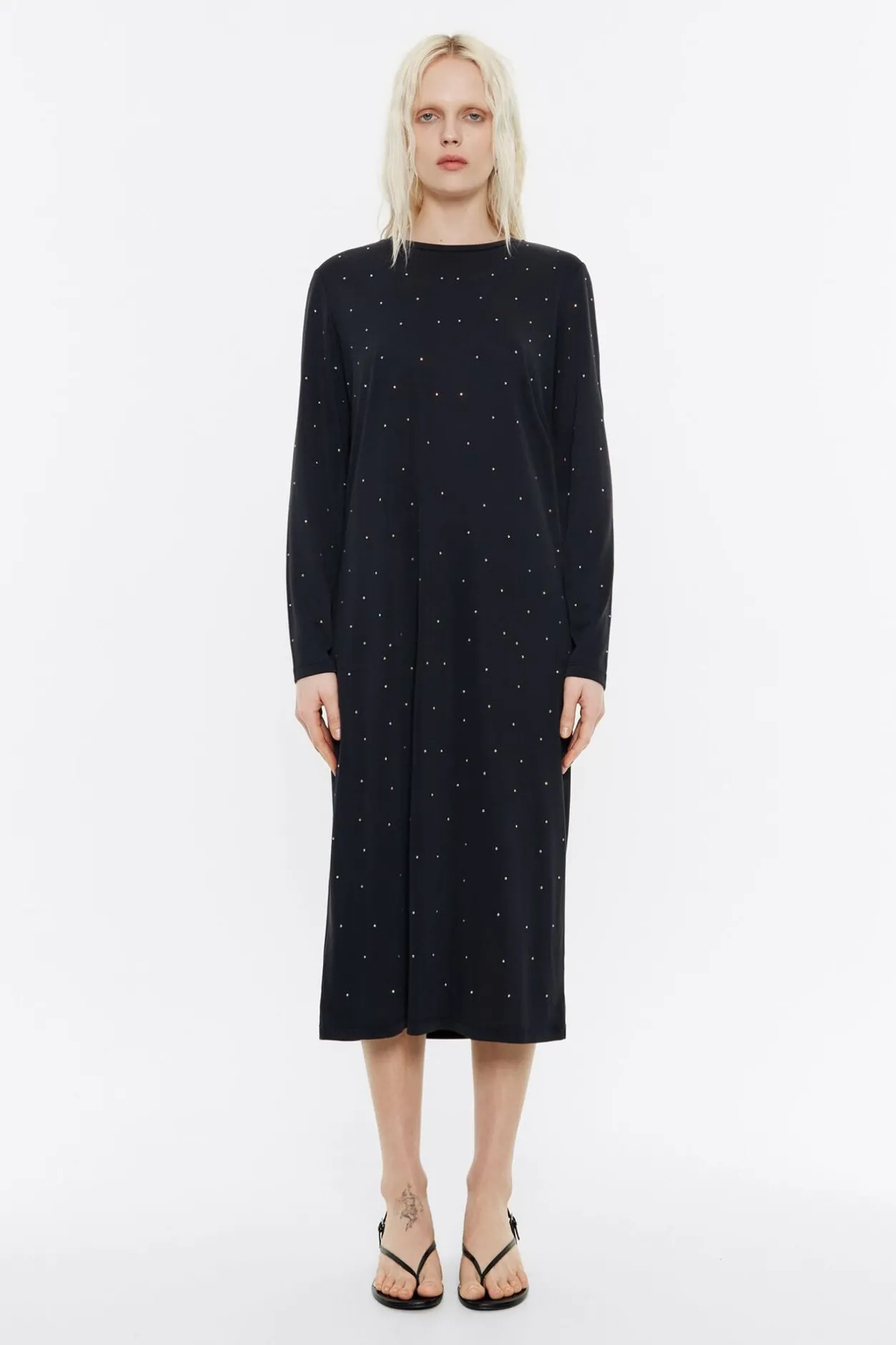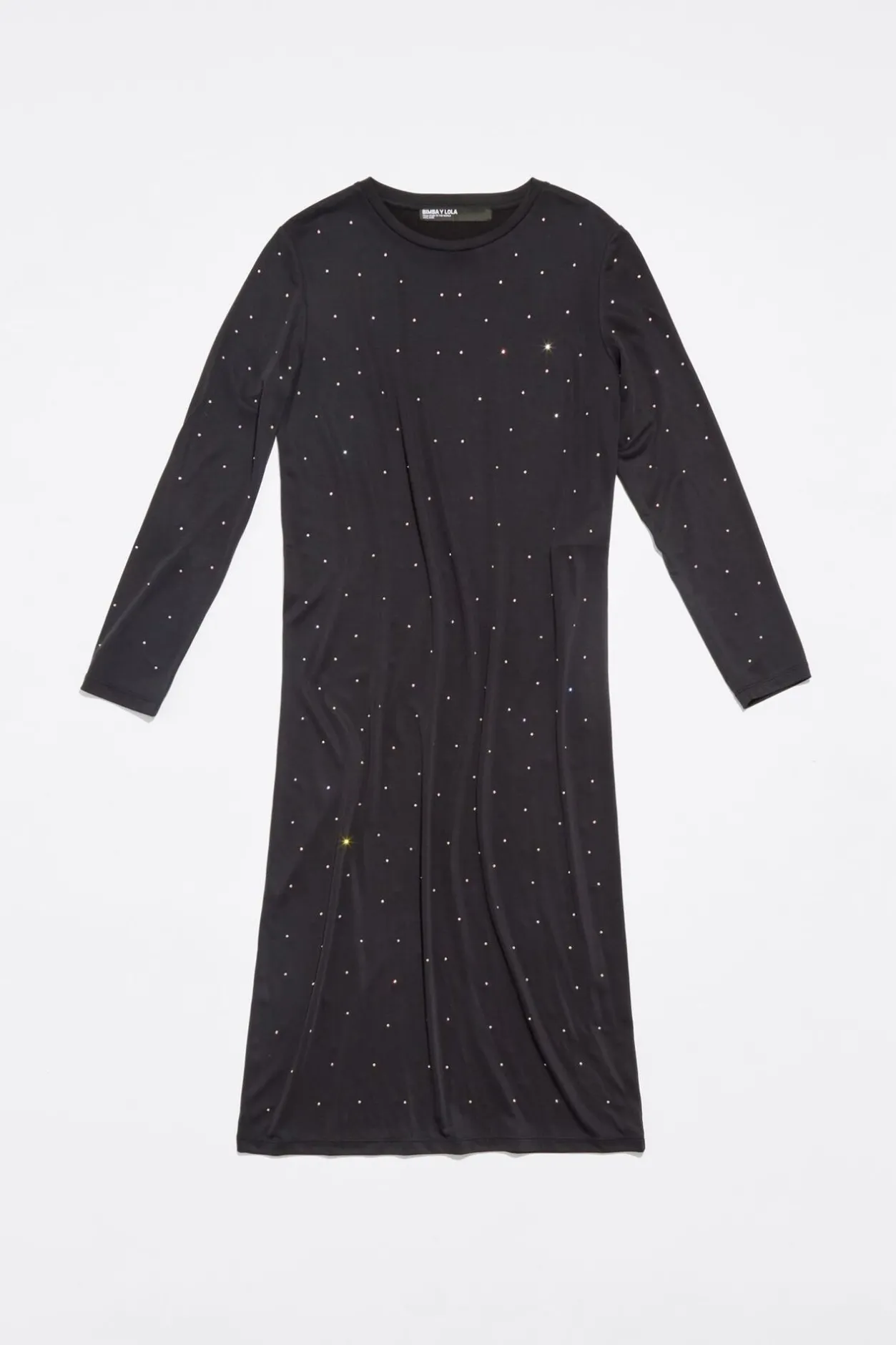Vestido En Tejido Fluido Con Cetalle De Brillos En Color Antracita. Modelo De Corte Recto, Largo Maxi, Manga Larga Y Cuello Redondo.