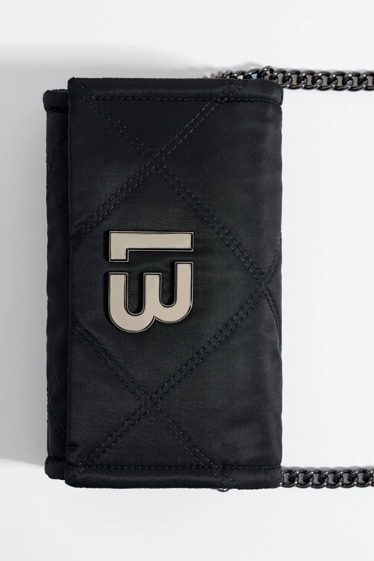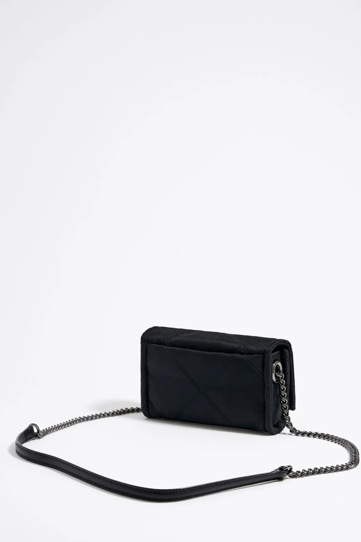 Bolso Bandolera De Tejido TÉCnico En Color Negro. Modelo De TamaÑO Mini, Cierre De Solapa Y Asa Bandolera De Cadena Con Tira De Piel. Exterior Personalizado Con Logo Lb MetÁLico.
