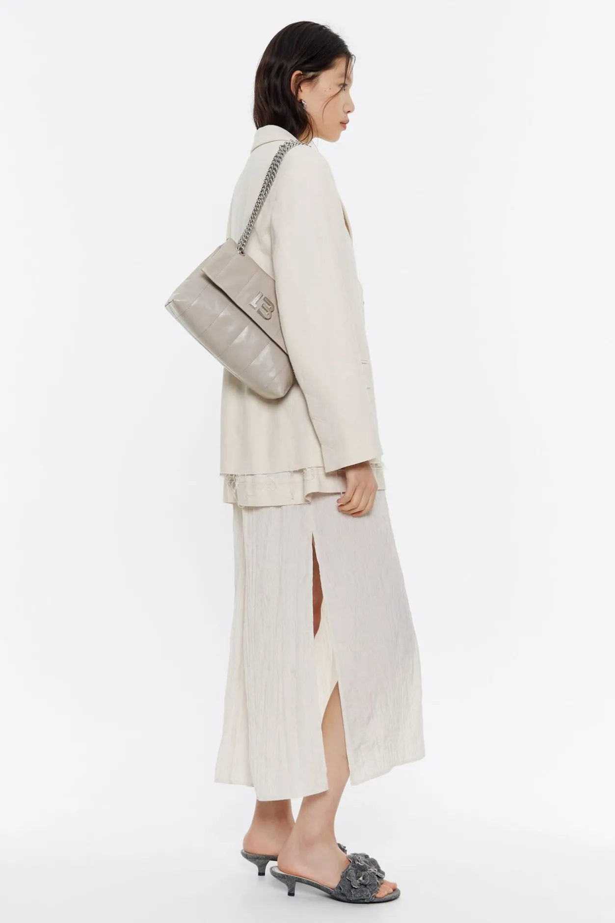 Bolso Bandolera De Piel En Color Gris Verdoso. Modelo De TamaÑO Mediano, Cierre MagnÉTico De Solapa Y Asa De Cadena. Exterior Personalizado Con Logo Lb MetÁLico. Este Modelo Contiene 100% PoliÉSter Reciclado.