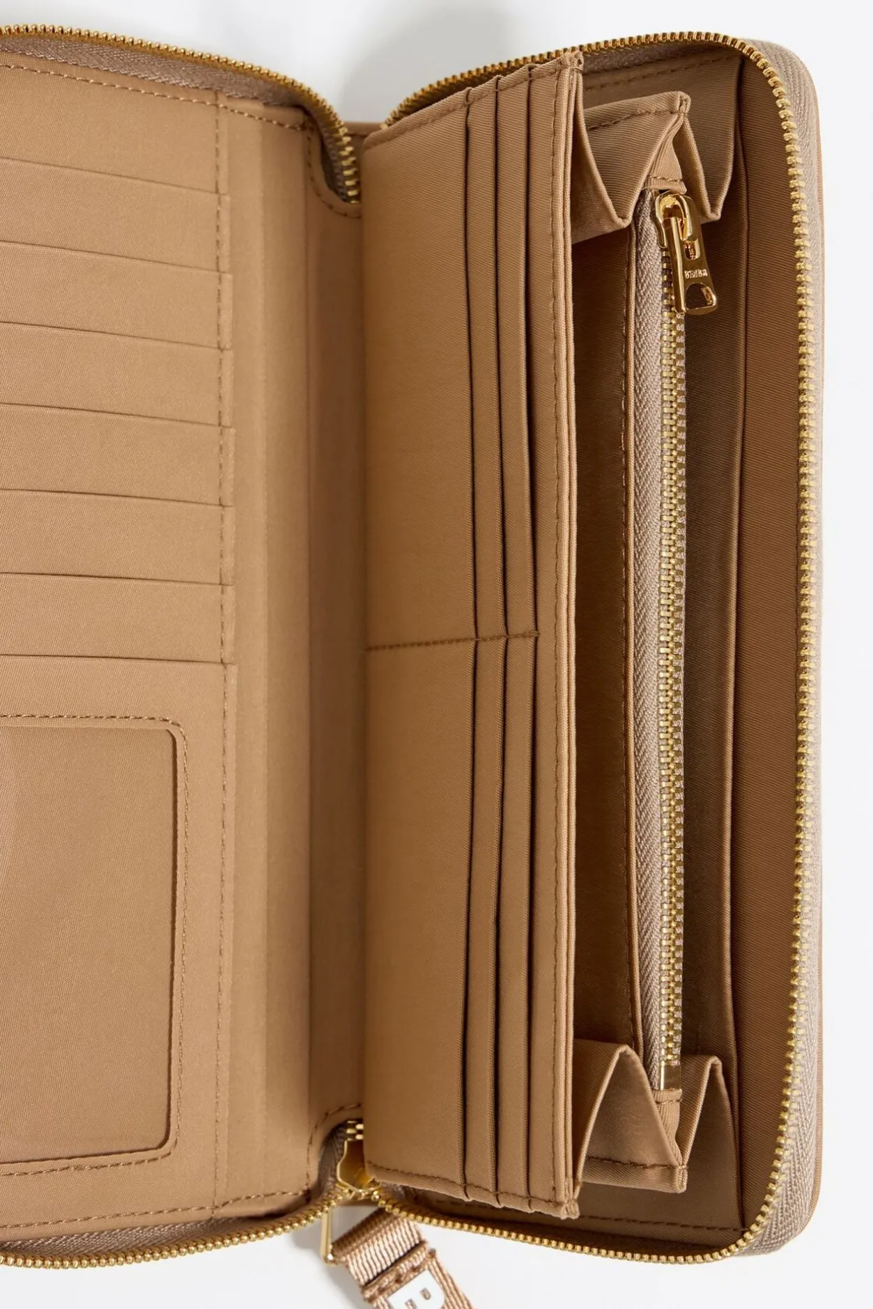 Billetera Horizontal De Nylon En Color Tostado. Modelo Con Cierre De Cremallera, Asa De Tejido Logotipada E Interior Con Monedero Y Tarjetero. Exterior Personalizado Con Logo MetÁLico.