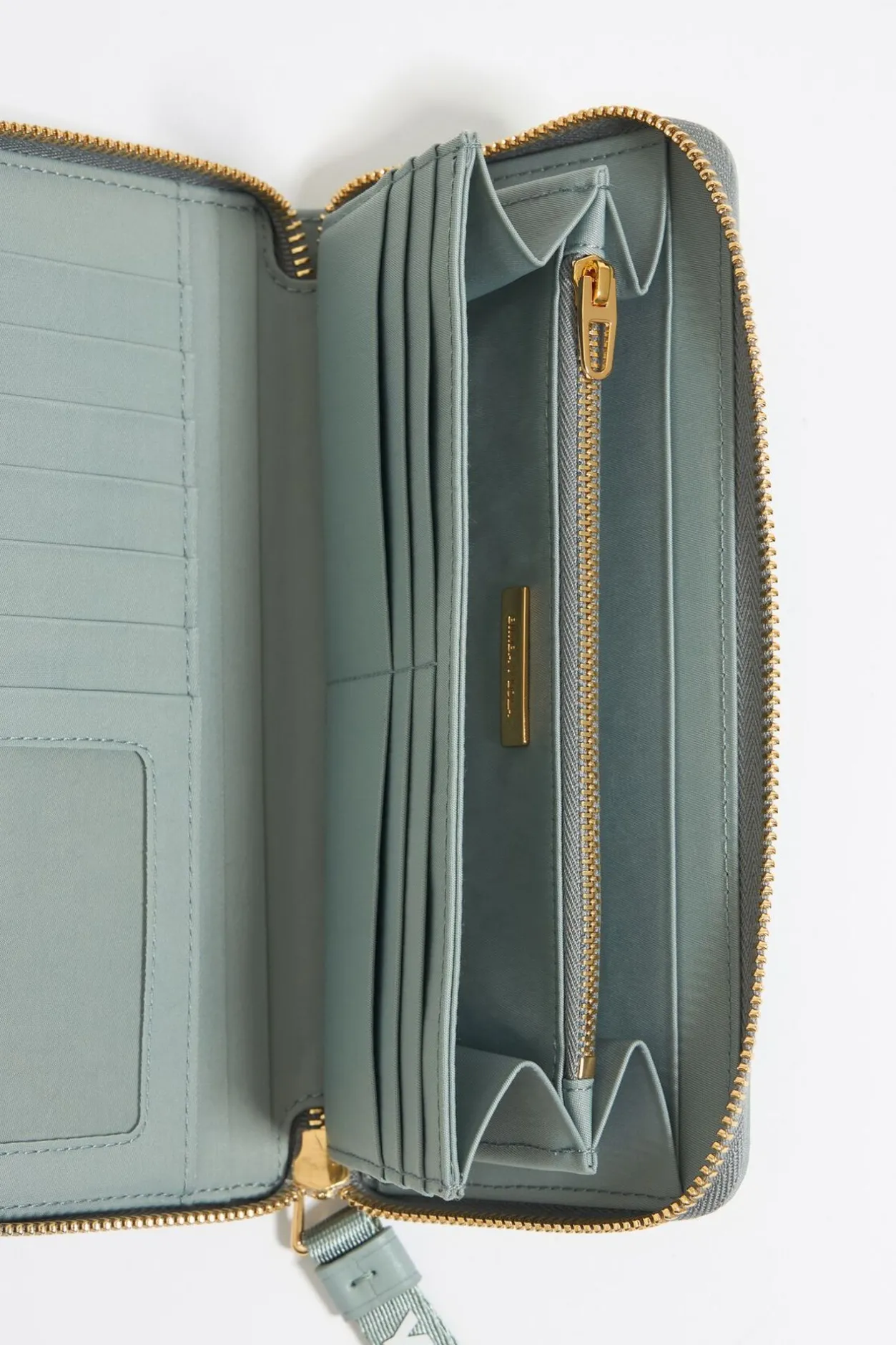 Billetera Horizontal De Nylon En Color Verde Agua. Modelo Con Cierre De Cremallera, Interior Con Monedero Y Tarjetero, Y Piezas De Piel. Exterior Personalizado Con Logo MetÁLico.