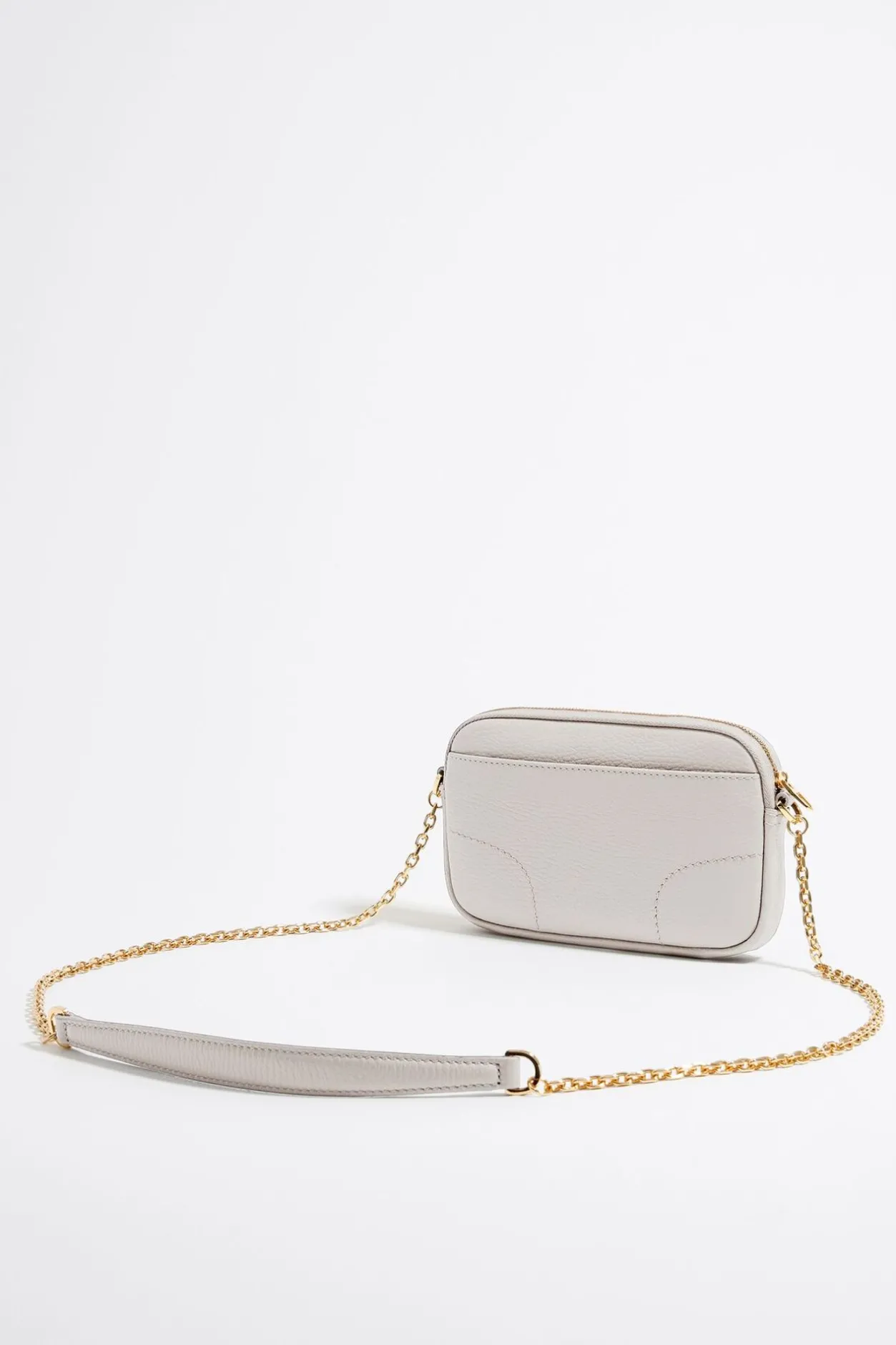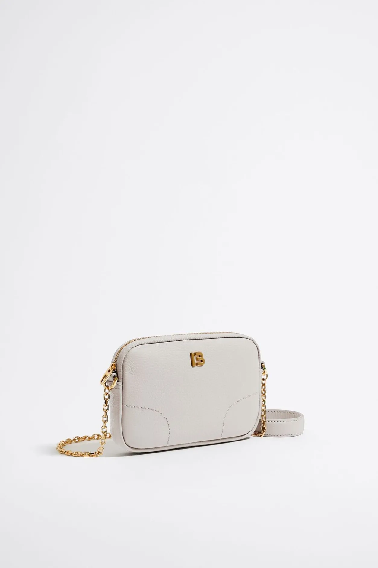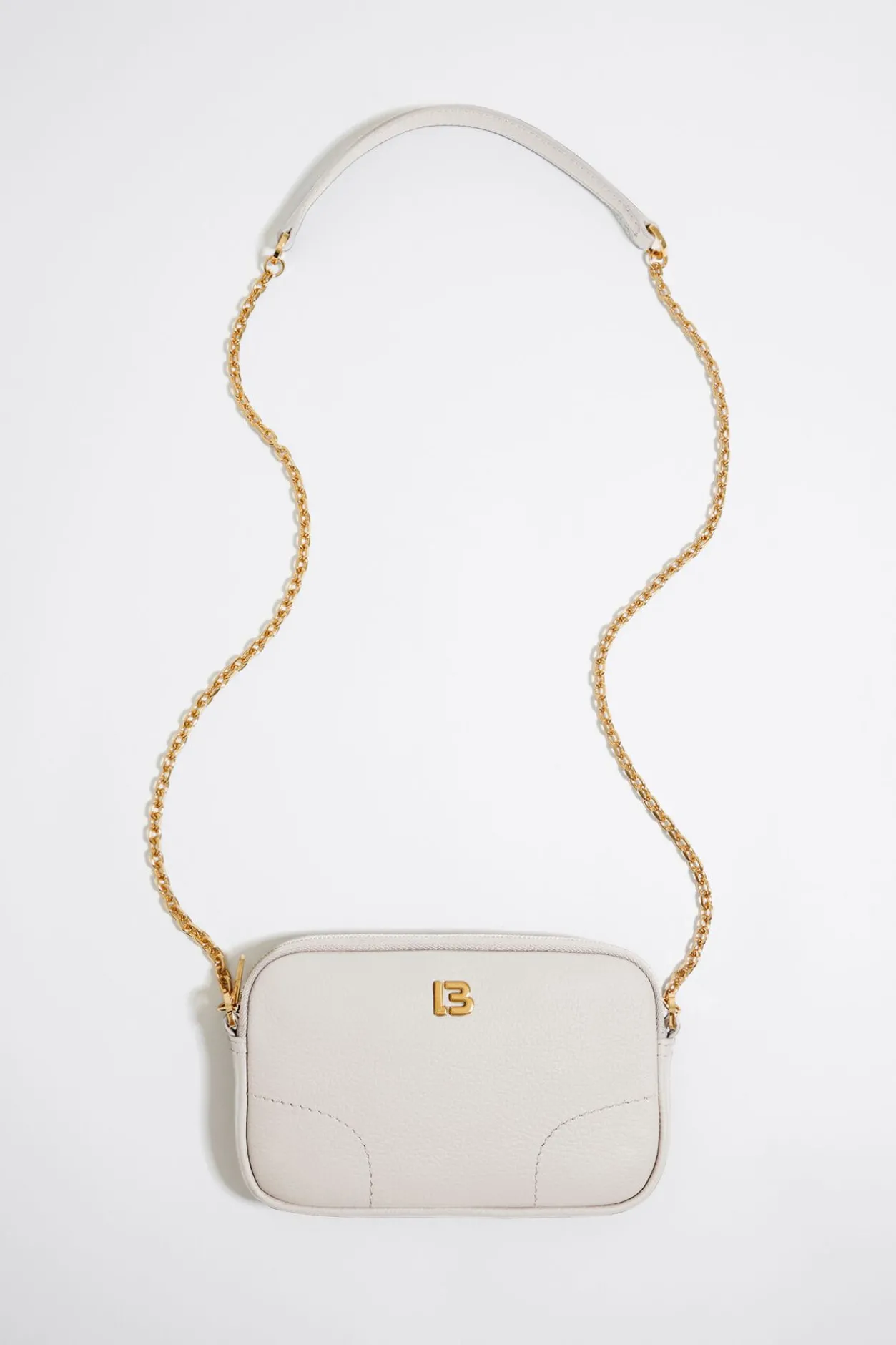 Bolso Bandolera De Piel En Color Blanco Roto. Modelo De TamaÑO Mini Con Cierre De Cremallera, Asa De Piel Y Cadena, Y Bolsillo Interior. Exterior Personalizado Con Logo Lb.
