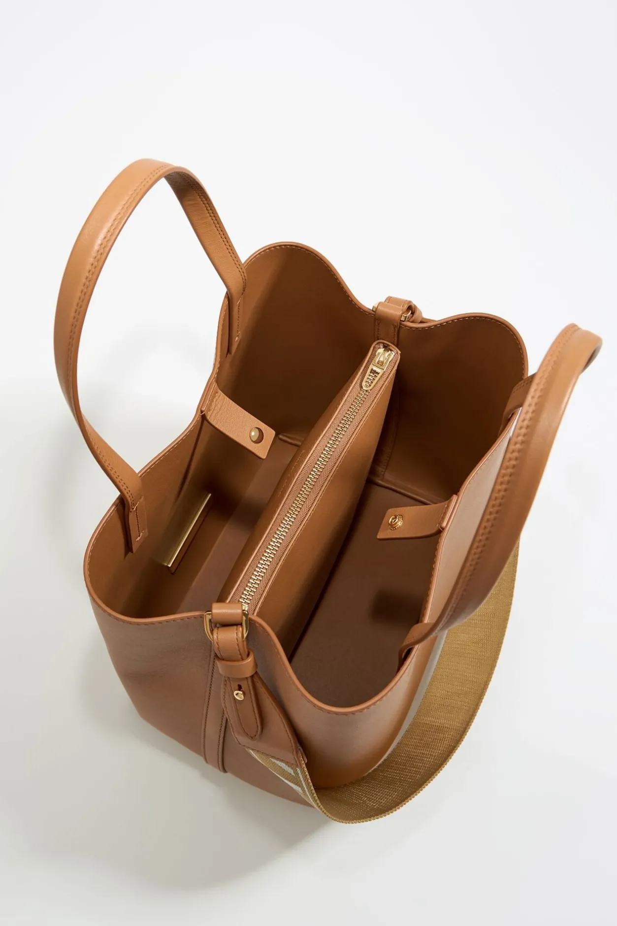 Bolso De Mano Chihuahua De Piel En Color Miel. Modelo De TamaÑO Grande, Cierre A PresiÓN, Doble Asa De Mano, Asa Larga De Tejido Logotipada Y Bolsillo Interior Con Cremallera. Exterior Personalizado Con Logo MetÁLico.