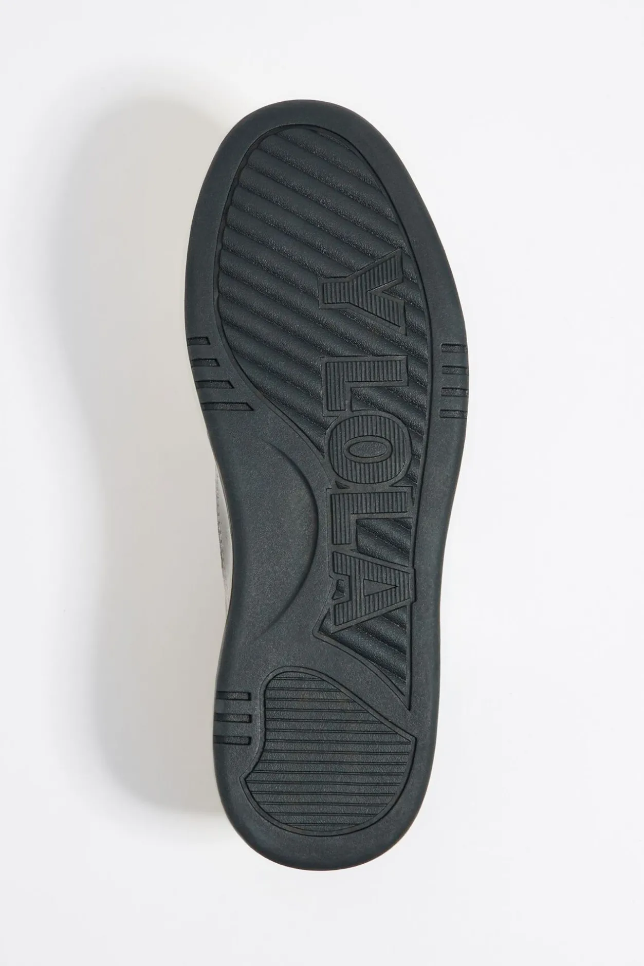 Deportiva Cupsole En Color Plata. Modelo De Piel Y Serraje Con Efecto Envejecido. Parte Trasera Con El Logo Grabado A Contraste Y LengÜEta Personalizada Con Logo. Piso Bicolor Logotipado.