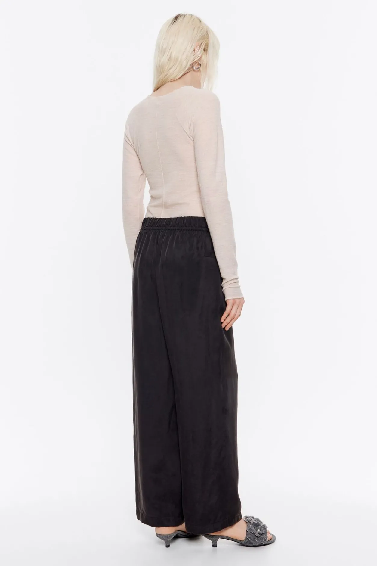 PantalÓN En Color Negro Lavado. Modelo Estilo Jogger, Largo Tobillero, Cintura Fruncida Con Cordones De Tejido Y Bolsillos Laterales Con Vivo. Este Modelo Contiene 47% Viscosa De ProducciÓN Responsable.