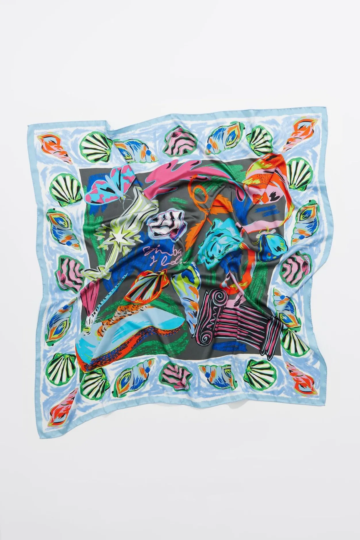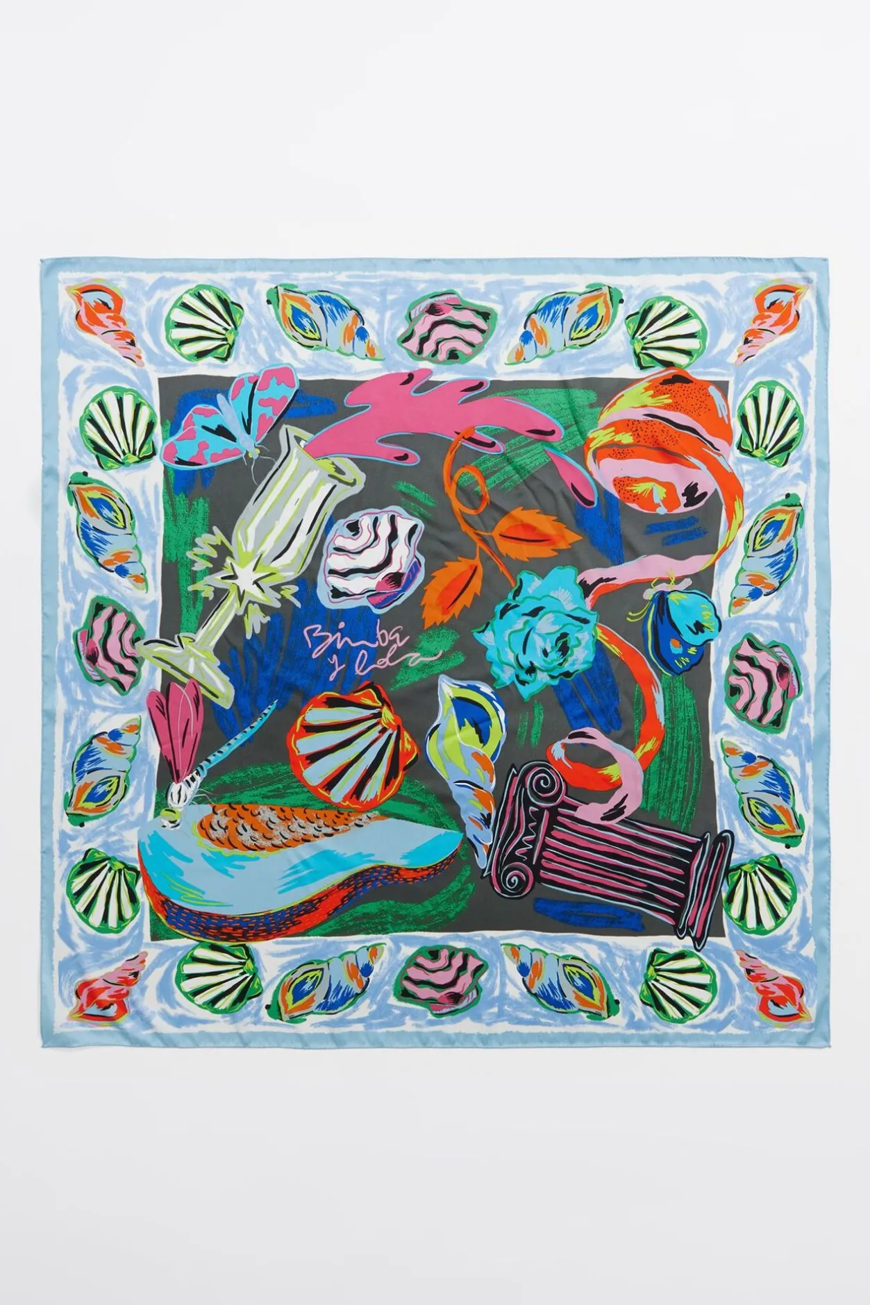 PaÑUelo Cuadrado Con Estampado De BodegÓN Con Marco De Caracolas Sobre Fondo Antracita. Modelo Personalizado Con Logo Estampado. 100% PoliÉSter Reciclado.