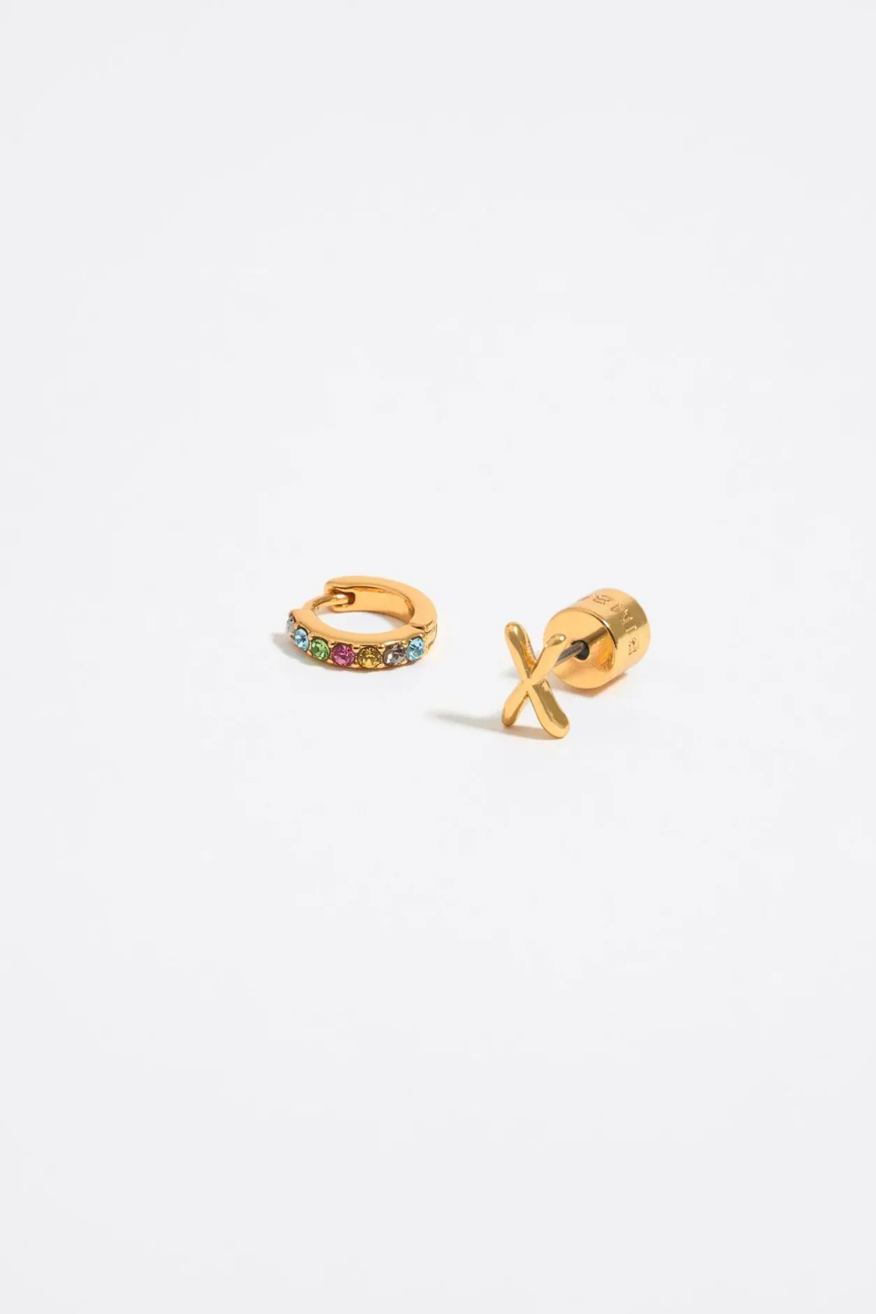 Pendientes Con Letra X Dorada Y Aro Mini De Metal Dorado Con Cristales Multicolores. Modelo Con Cierre A PresiÓN. Personalizado Con El Logo Grabado.