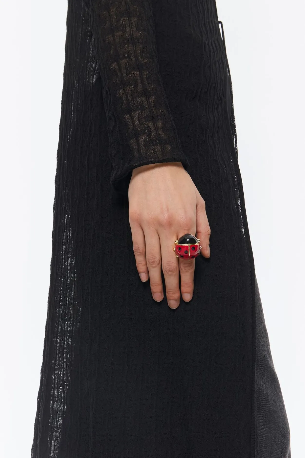 Anillo De Metal Dorado Con Forma De Mariquita Esmaltada En Rojo Y Negro.