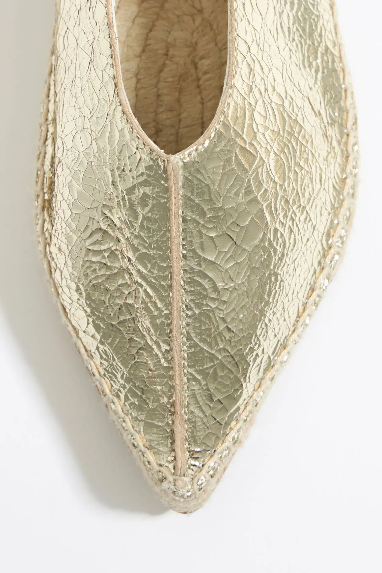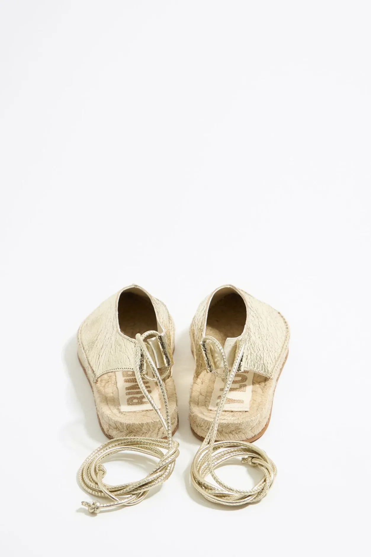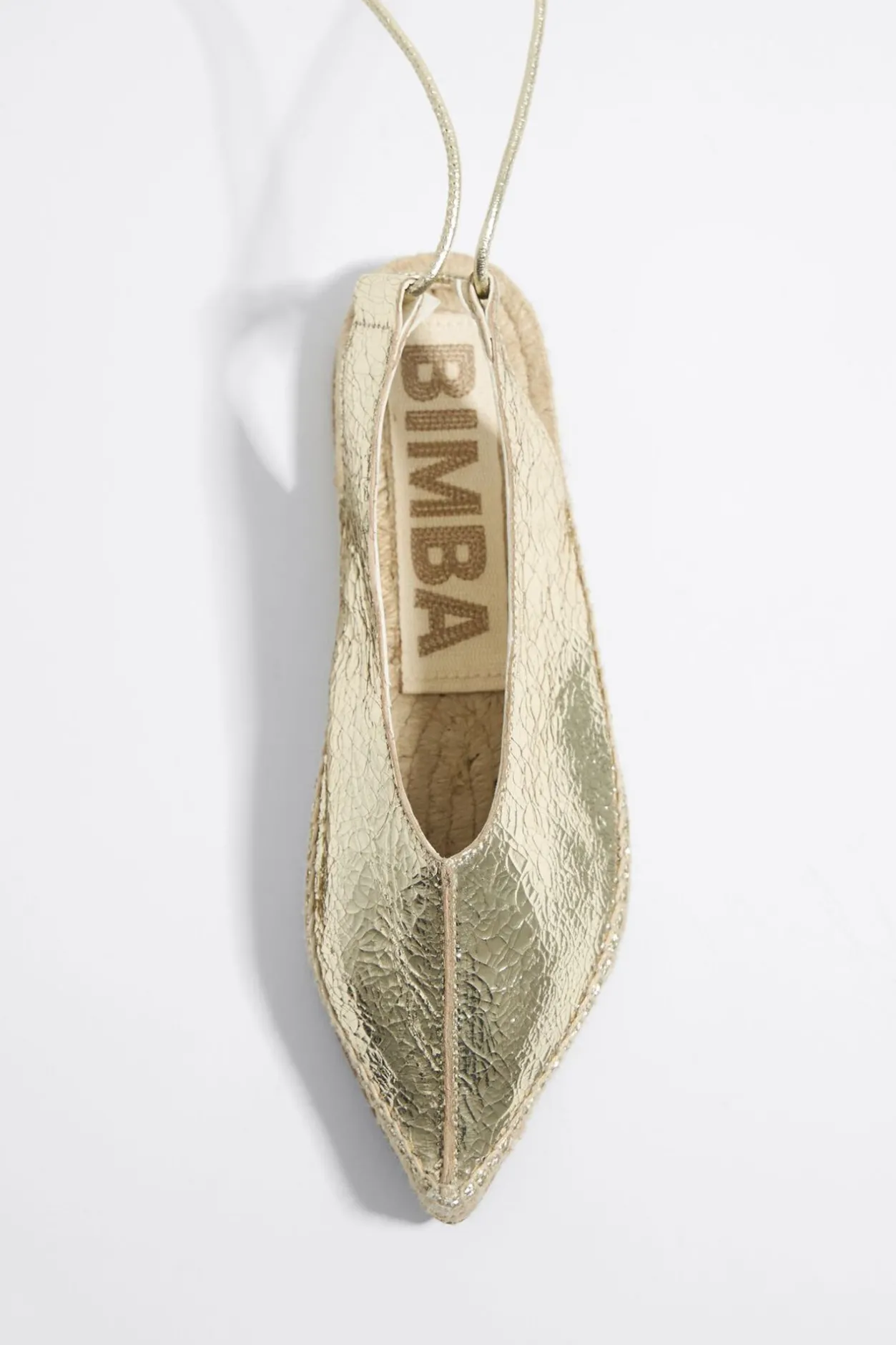 Bailarina De Piel En Color Oro Acabada En Punta. Modelo Destalonado Con CordÓN De Piel Para Enlazar En El Tobillo. Etiqueta Con Logo Bordado En Plantilla Y Piso De Yute Con Suela Personalizada.