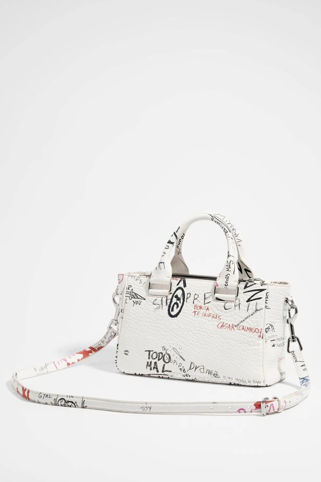 Bolso Tote Pocket De Piel Con Print Wall Is Love En Color Blanco. Modelo De TamaÑO Mediano, Con Dos Compartimentos Con Cierre De Cremallera Y Tira De Piel Con Snap, Doble Asa De Mano Y Asa Bandolera De Piel. Interior Personalizado Con Etiqueta De Piel. Exterior Personalizado Con Logo MetÁLico.