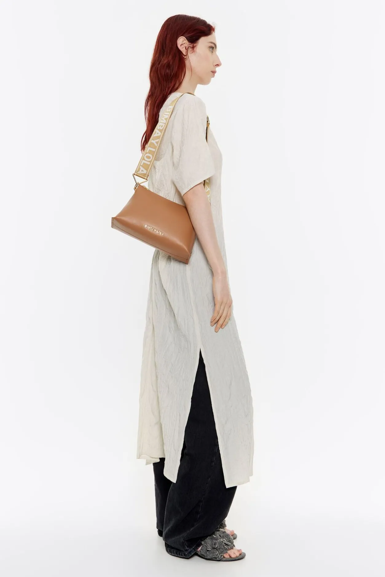 Bolso Trapecio De Piel En Color Miel. Modelo De TamaÑO PequeÑO, Cierre De Cremallera, Asa Larga De Tejido Logotipada Ajustable Y Bolsillo Interior. Exterior Personalizado Con Logo MetÁLico.