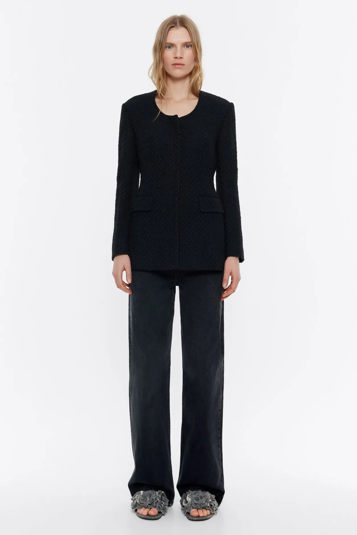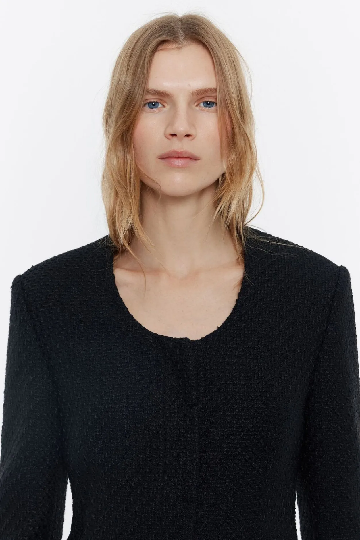 Chaqueta Ajustada De Tweed En Color Negro. Modelo Con Escote Caja Pronunciado, Manga Larga, Cierre Frontal Con Botonadura Y Bolsillos Con Tapeta En El Delantero.