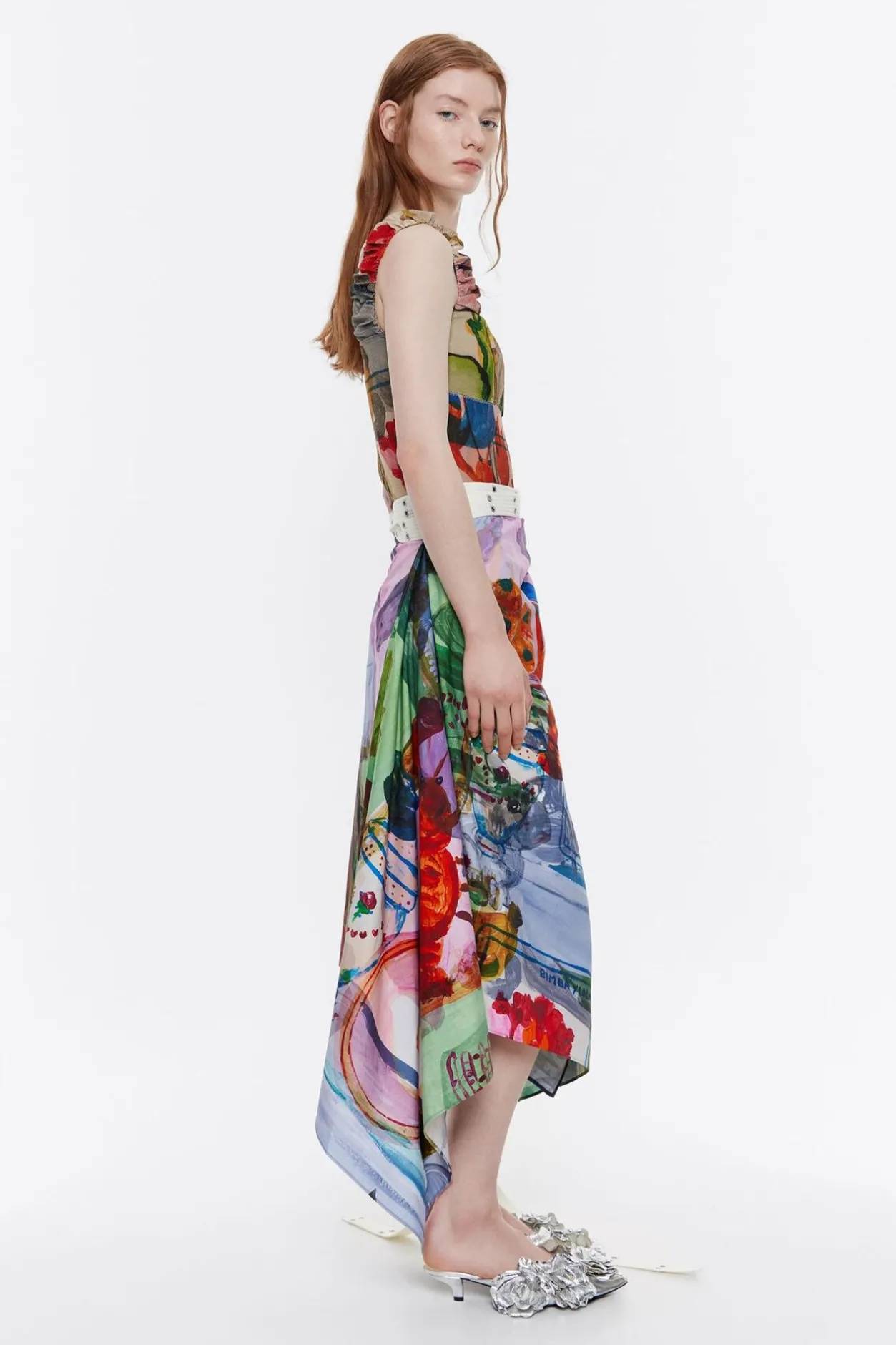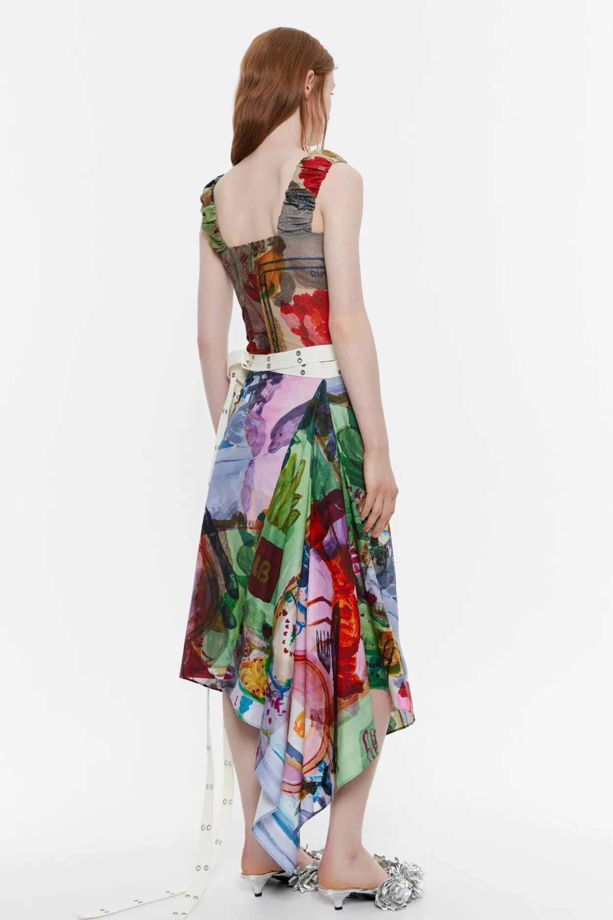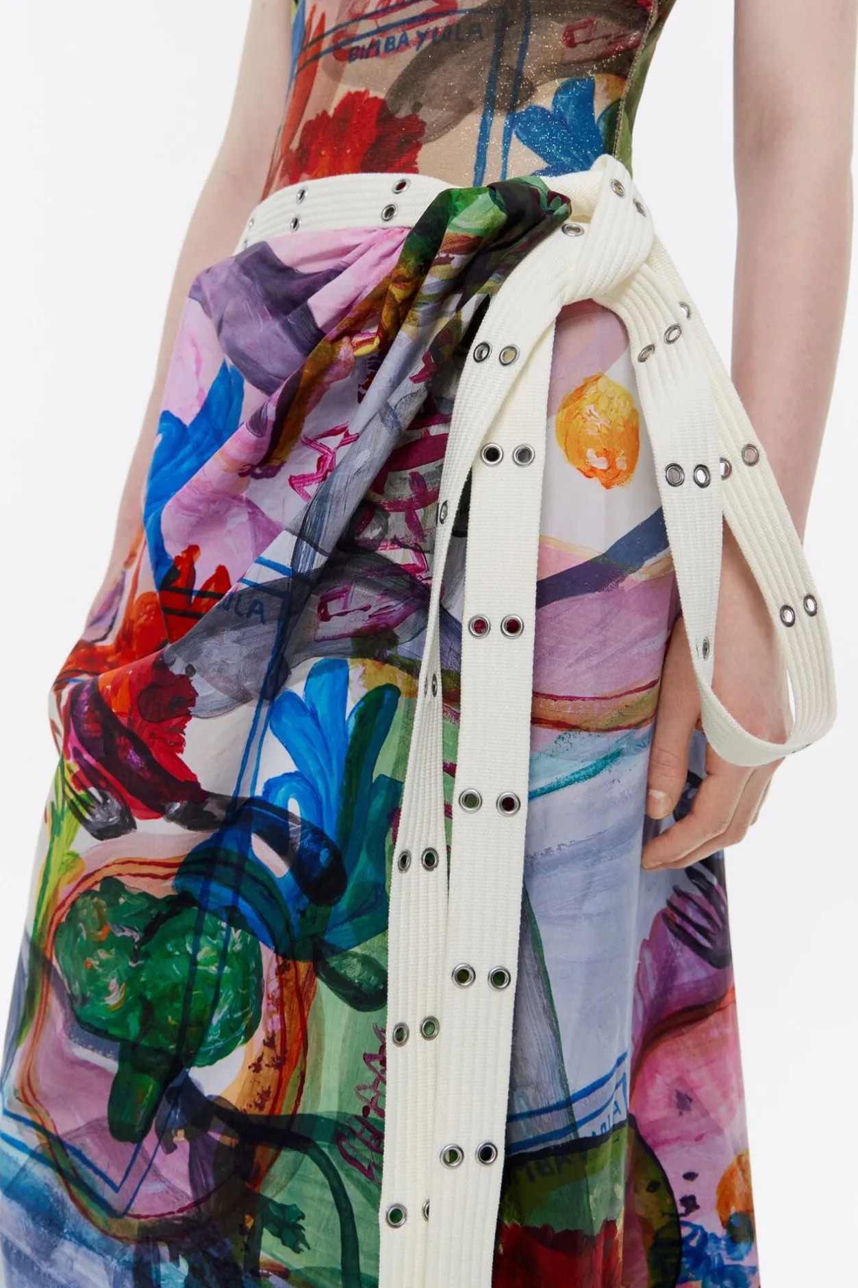 Falda Pareo De AlgodÓN Con Textura Con Print Parque Full. Modelo De Corte Recto, Largo Midi Y CinturÓN Extra Largo Con Ojetes A Modo De Cierre.
