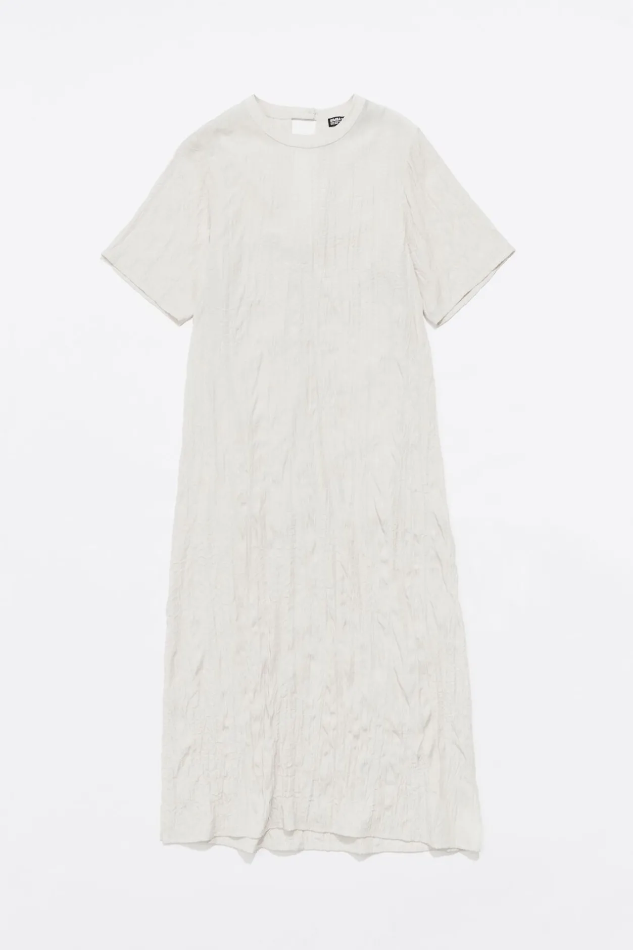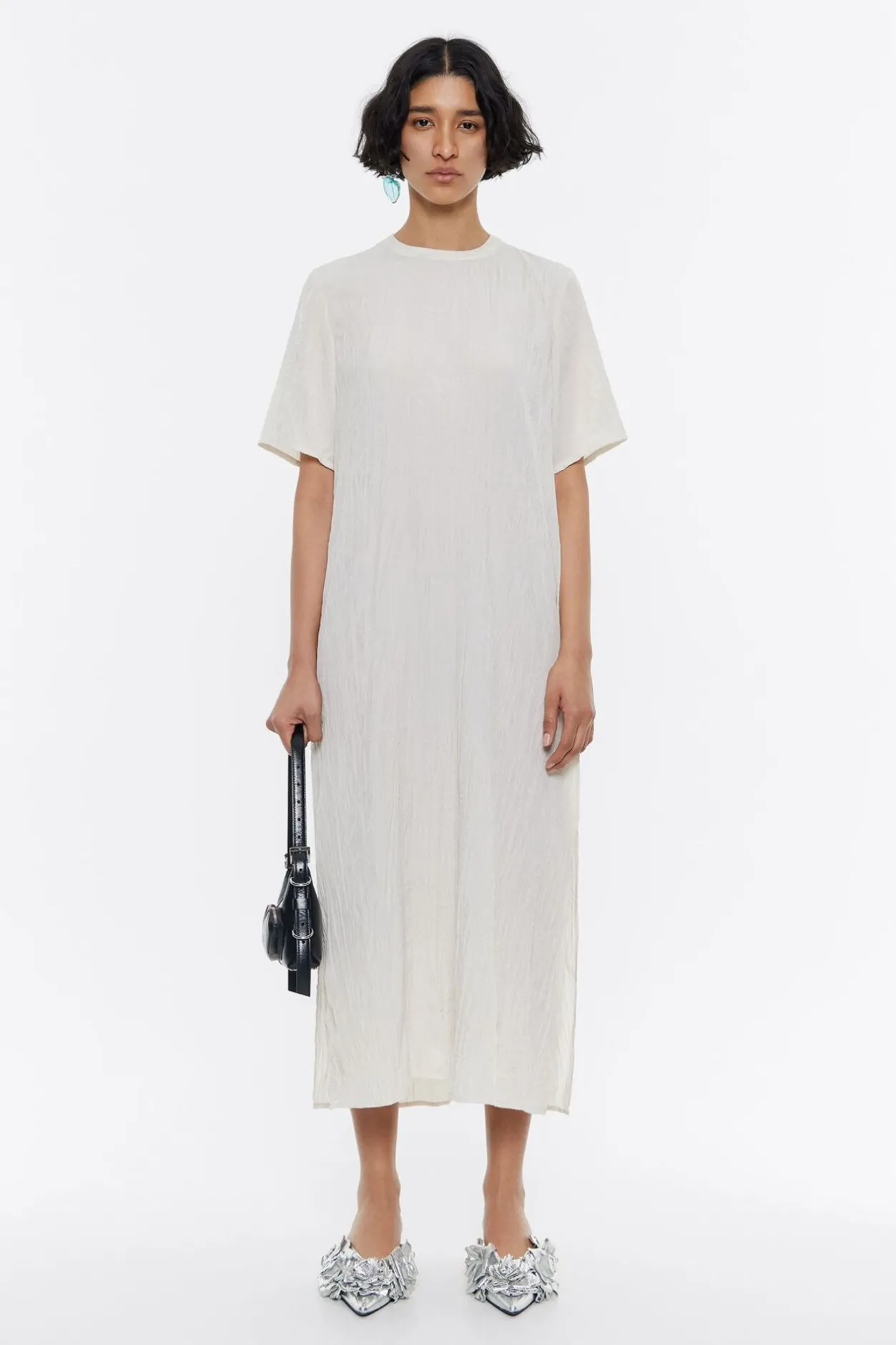Vestido Midi De Viscosa Con Textura En Color Mantequilla. Modelo De Corte Recto, Con Cuello Caja Con Tira De Punto Larga, Manga Corta Y Cierre Con BotÓN Trasero. Abertura Pronunciada En La Espalda Con Falso Nudo Y Aberturas Laterales.