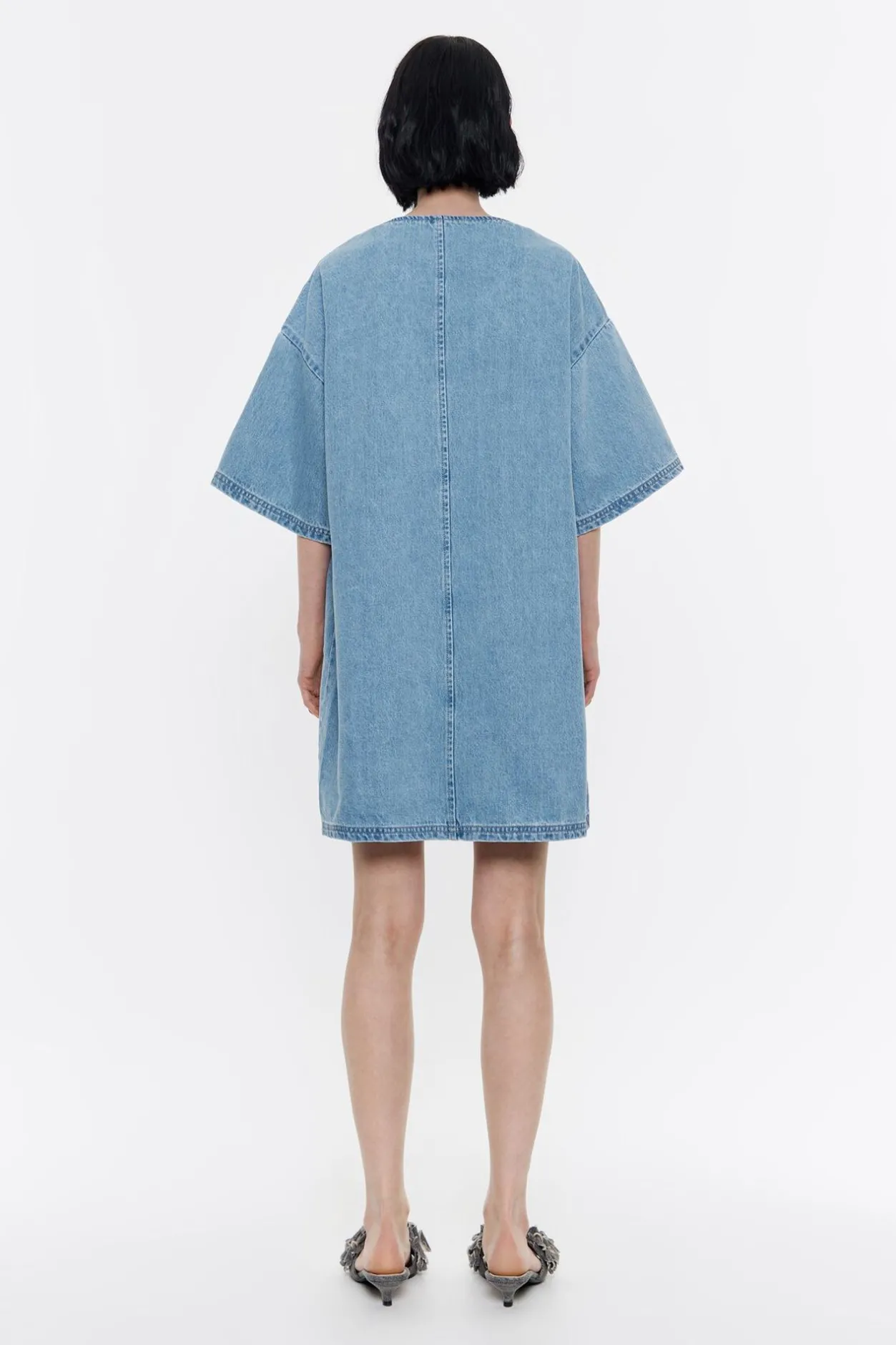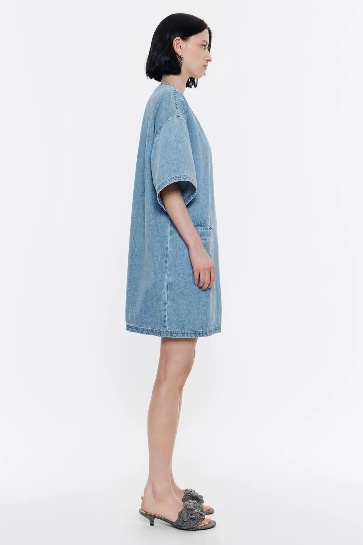 Vestido Denim Corto En Color Azul. Modelo De Corte Recto, Escote Caja, Manga Corta Y Bolsillos Con Vivo En El Delantero.
